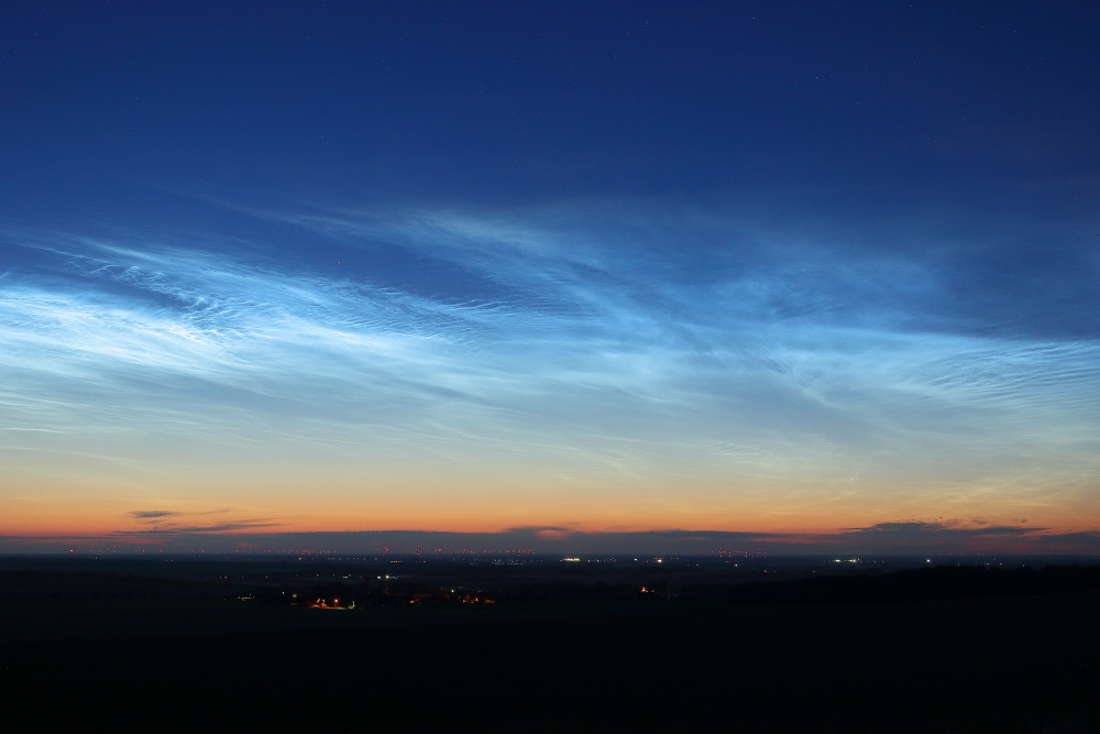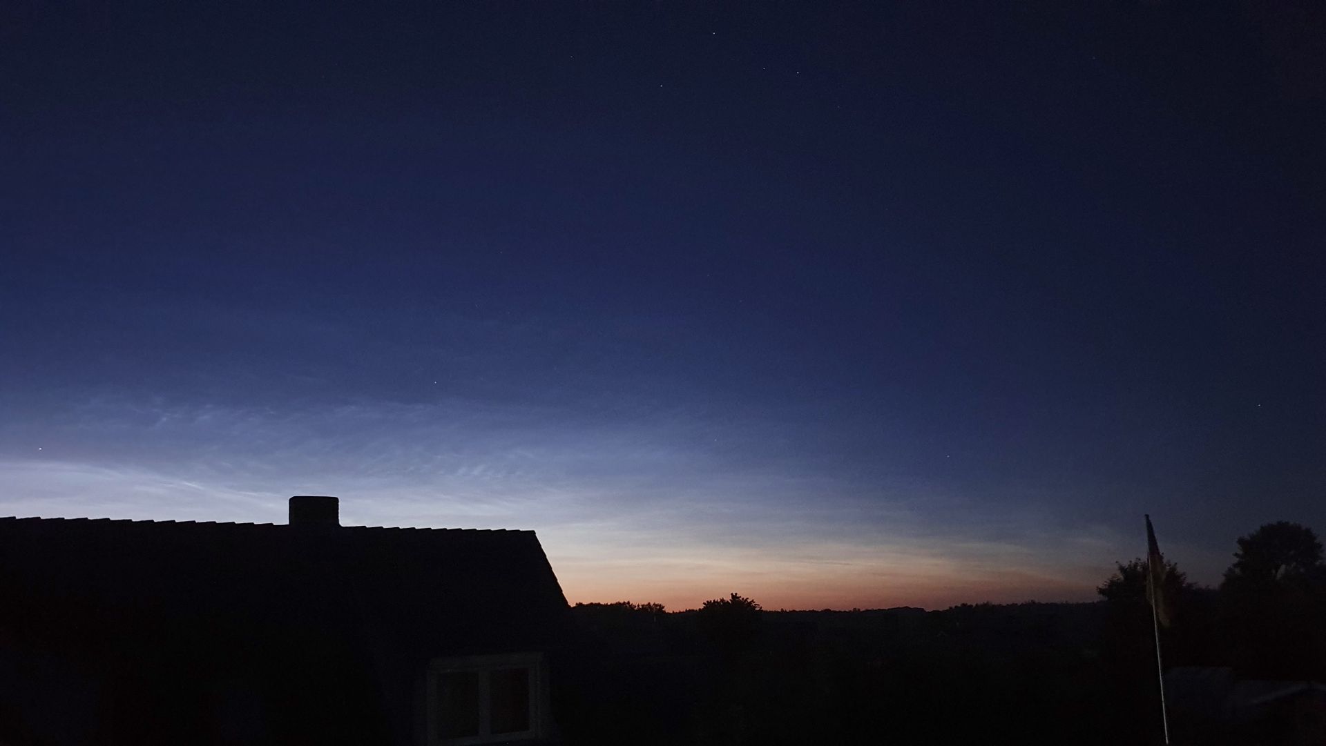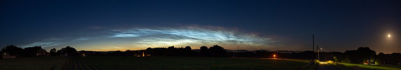 hier ein Panorama von 2:40 MESZ aus der Nähe von Heiligenhafen. Das war ein wirklich großes NLC-Ereignis heute Morgen. Später waren sogar der Mond und Jupiter von NLC umgeben. An den Bildern aus Leipzig ist auch offensichtlich, dass da eine große NLC-Front von Osten hineinzog. Später mehr.