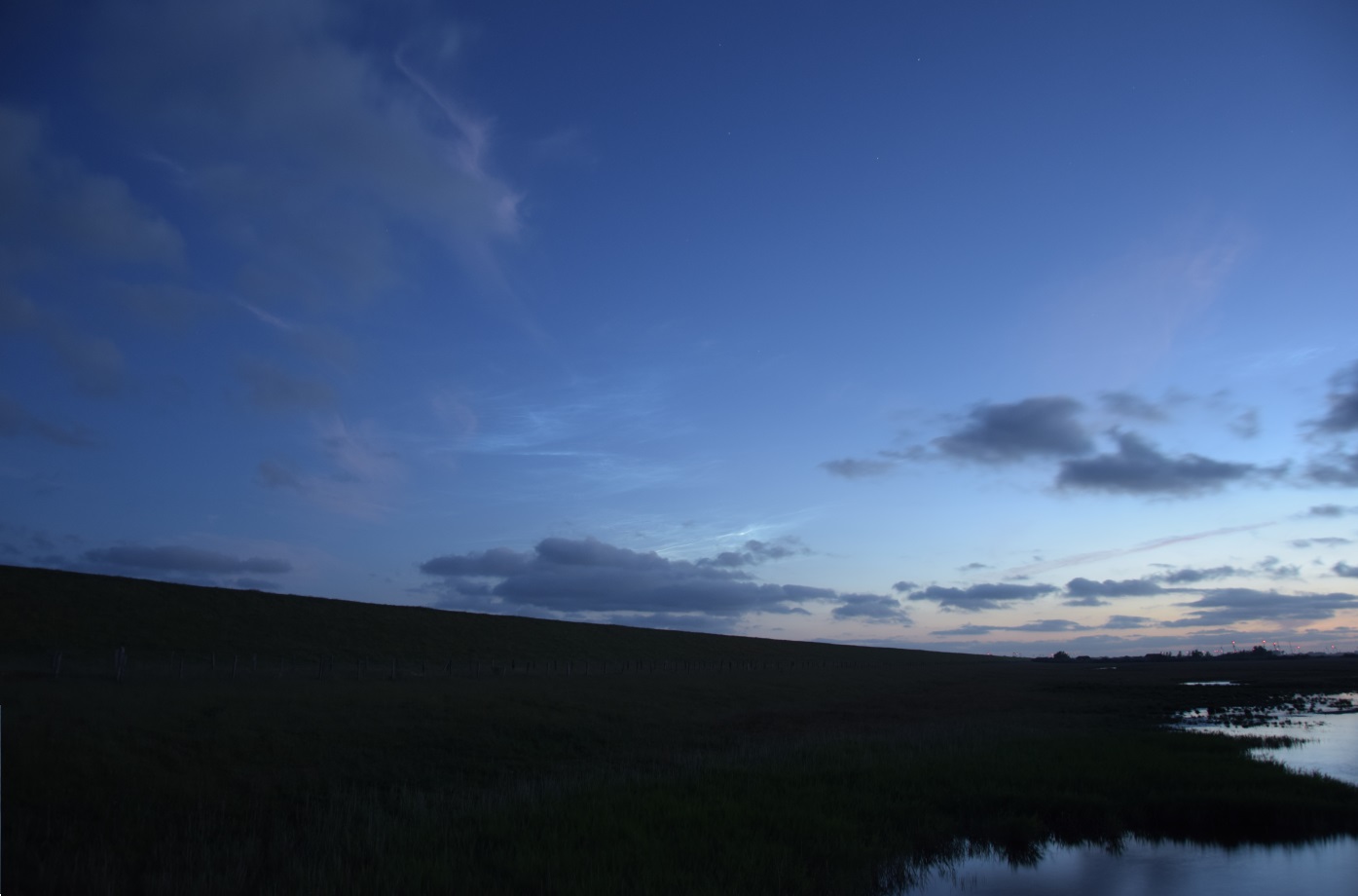 hier ein Panorama von 2:40 MESZ aus der Nähe von Heiligenhafen. Das war ein wirklich großes NLC-Ereignis heute Morgen. Später waren sogar der Mond und Jupiter von NLC umgeben. An den Bildern aus Leipzig ist auch offensichtlich, dass da eine große NLC-Front von Osten hineinzog. Später mehr.