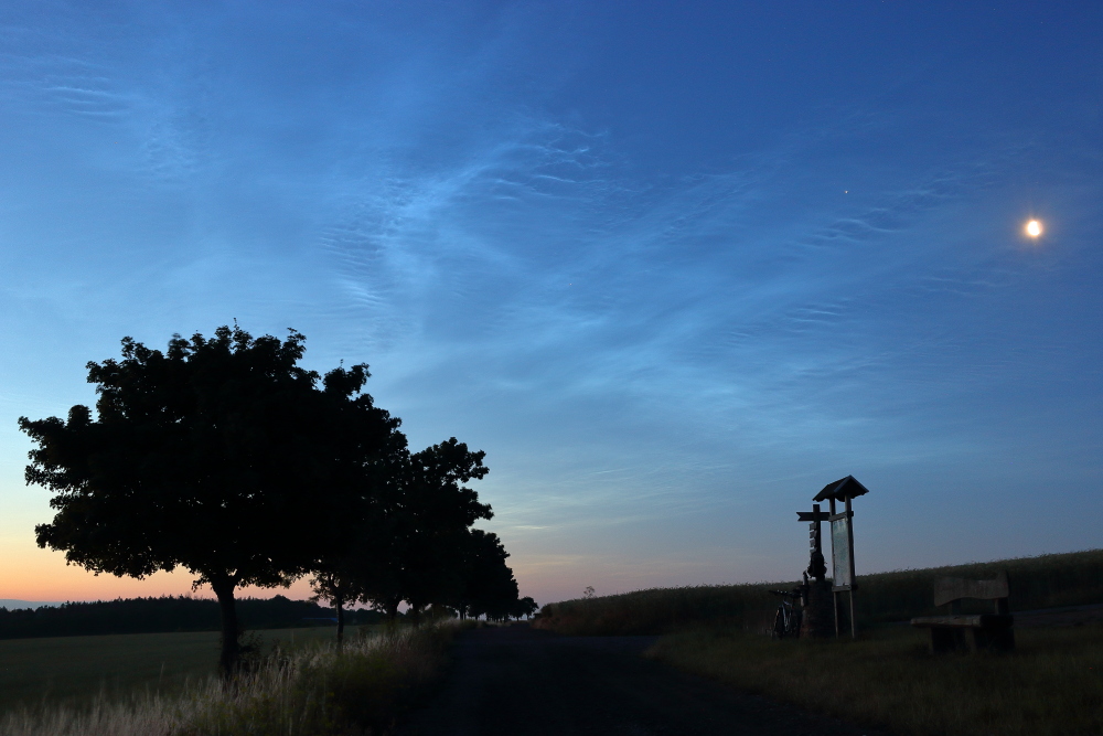 Der Wecker hat um 2:20 Uhr (MESZ) geklingelt, schlaftrunken wurde er weggedrückt... schließlich hat mich der Hund geweckt, da kann ich dem Kleinen einfach nur dankbar sein. Schnell ging es vor die Tür, kaum ließ ich die letzten Siedlungshäuser hinter mir und schaute über das Feld gen NNO, verschlugen mir die hellen NLCs samt rotem Saum erst einmal die Sprache. Es folgen die Daten zur NLC-Nacht an meinem Standort:
