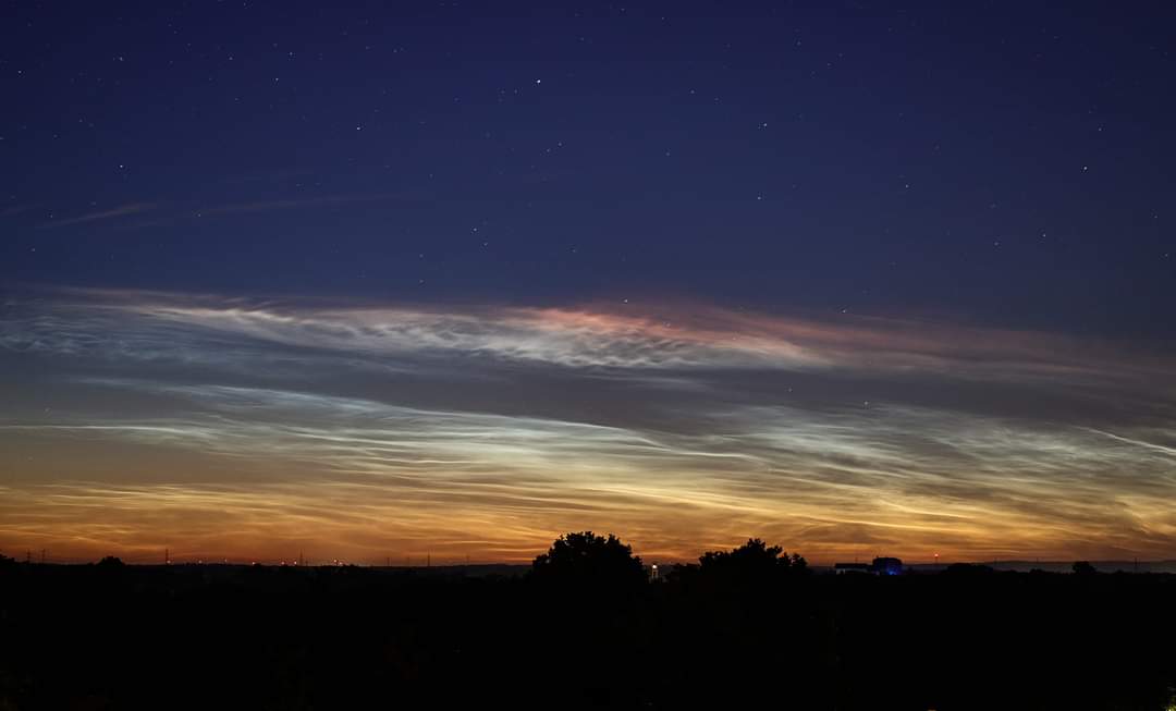 hier ein Panorama von 2:40 MESZ aus der Nähe von Heiligenhafen. Das war ein wirklich großes NLC-Ereignis heute Morgen. Später waren sogar der Mond und Jupiter von NLC umgeben. An den Bildern aus Leipzig ist auch offensichtlich, dass da eine große NLC-Front von Osten hineinzog. Später mehr.