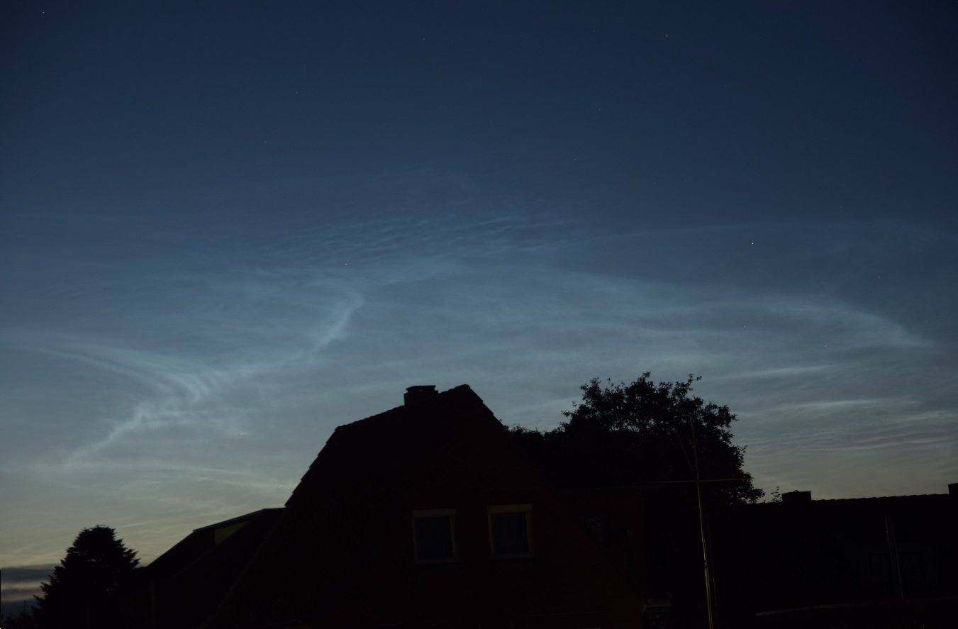 auch aus Wardenburg konnte ich die NLC beobachten. Ab ca. 23:30 Uhr MESZ ließen sich feine Strukturen etwa in Richtung 35° ausmachen. Die Höhe betrug nur wenige Grad, sie reichten knapp über die entfernten Baumwipfel. Die Helligkeit war zu dem Zeitpunkt mit H1 einzustufen.