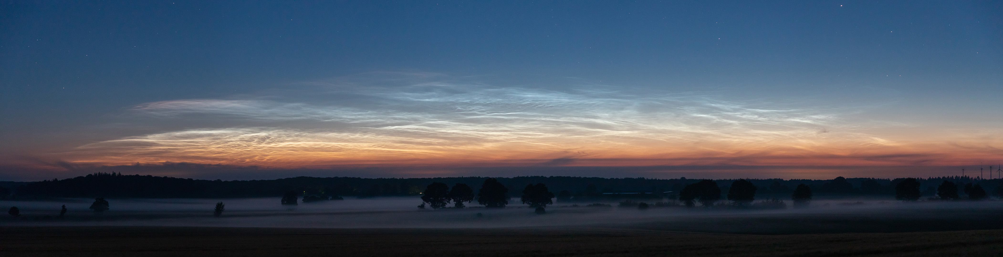 ich war nach Mitternacht in der Nähe von Talkau und konnte die NLC von dort sehr schön beobachten. Sie erreichten zwar keine große Höhe über dem Horizont, erreichten aber Helligkeit 3. Zum Morgen hin baute sich das ganze ab und ich beendete die Beobachtung gegen 2:30 MESZ. Schön waren die im Tal wabernden Nebelfelder-