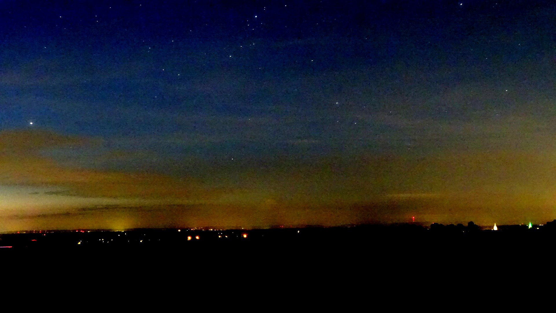 Gladbeck, N-NO 10° hoch. In der früheren Dämmerung sicher deutlich höher aber diffus und möchte meinen Zeitraffer nicht für ne Bildkontrolle unterbrechen. Diese Aufnahme ist von der "kleinen" RX100 gerade eben.
