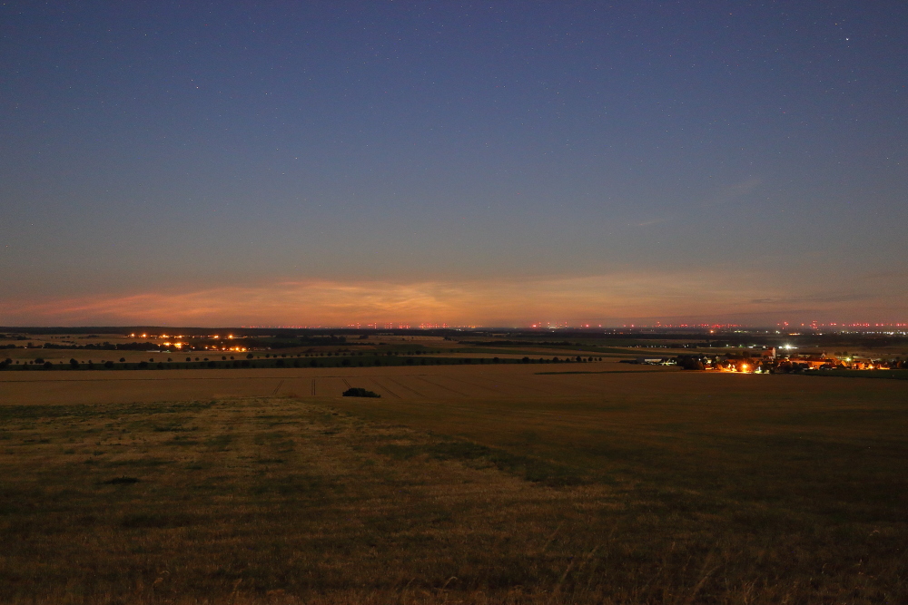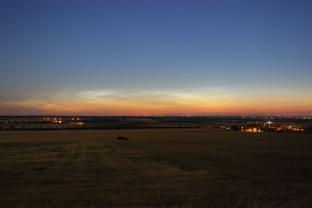 Von mir auch ein erstes Belegfoto aus der zweiten Nachthälfte. Leider war der Nordhorizont, wie befürchtet, bereits sehr stark eingetrübt, so dass feine Details auf meiner Aufnahme zumindest in der komprimierten Variante mit geringer Auflösung nicht mehr zu erkennen sind. Im Vergleich zu meiner vorherigen NLC-Nacht waren die äußeren Bedingungen diesmal auch komplett andere. Während ich Sonntag früh noch bei Temperaturen bis 7°C fröstelte, reichten diesmal bereits kurze Hosen aus.