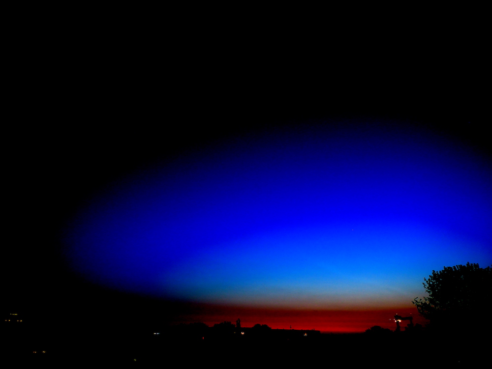 Nachweisbar innerhalb der vorhandenen Bildkanten, maximal von ca. 340 - 030 bei größter Höhe in schneller Näherung um ca. 10° bis ca. N, dann absinkend nach NO. Teils dachte ich auch an einen Kontrasteffekt an schwachem Dunst, dann sieht es doch wieder "echt" aus.