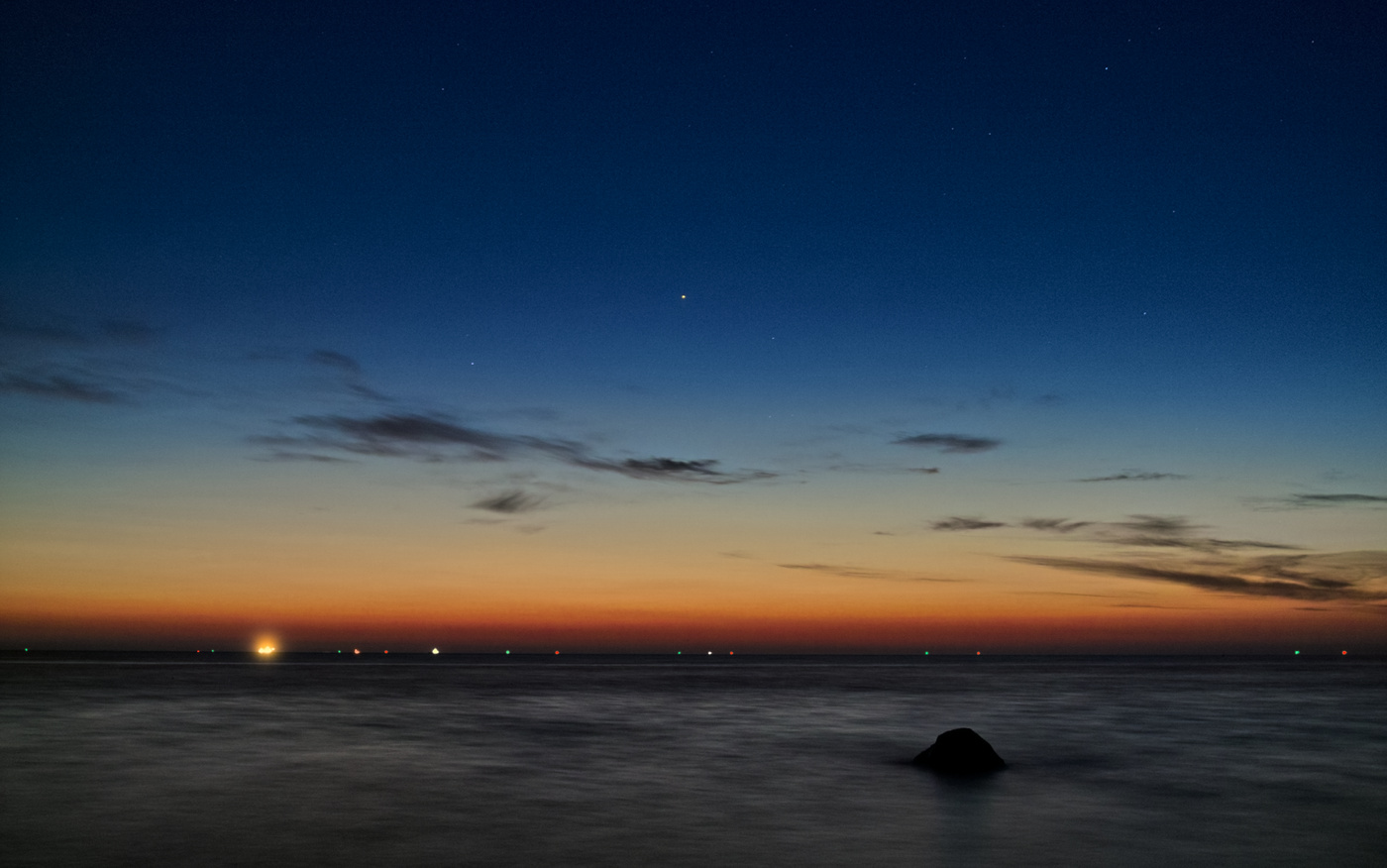 Kurz nach 2:30Uhr MESZ erreichte die Dämmerungshelligkeit jene Schwelle, wo Fotografie mit dem - bewusst gewählten - musealen DSLR-Dinosaurier technisch möglich wurde. Ohne (offensichtliche) NLCs am Himmel bestimmte sich der gewählte Bildausschnitt danach, ein reines Erinnerungsfoto der Situation mit Meer, Schiff, Stein, sowie dem Sternbild Fuhrmann über allem, nach Hause zu tragen. Zufällig verewigten sich auf den ersten Bildern am linken Bildrand dennoch ein paar sublime NLC-Zipfelchen.