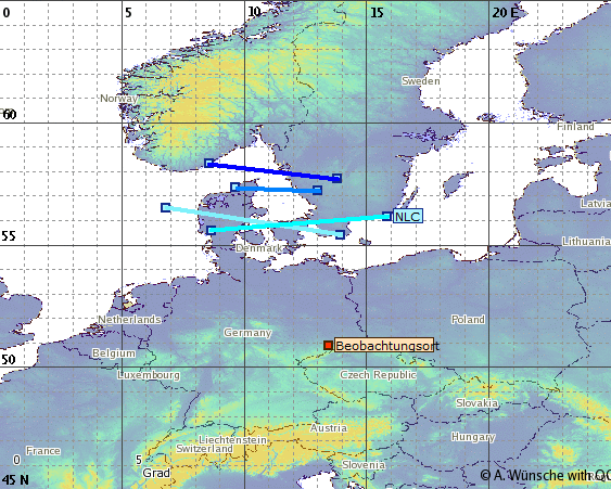 Die unterschiedlichen Positionen des jeweils sichtbaren Südrands resultieren aus den unterschiedliche Blickwinkeln und Beobachtungszeiten. Dessen ungeachtet zeigen die vier Meldungen in der Zusammenschau die Mindestausdehnung des Aufenthaltsraums der NLCs im Abendsektor.