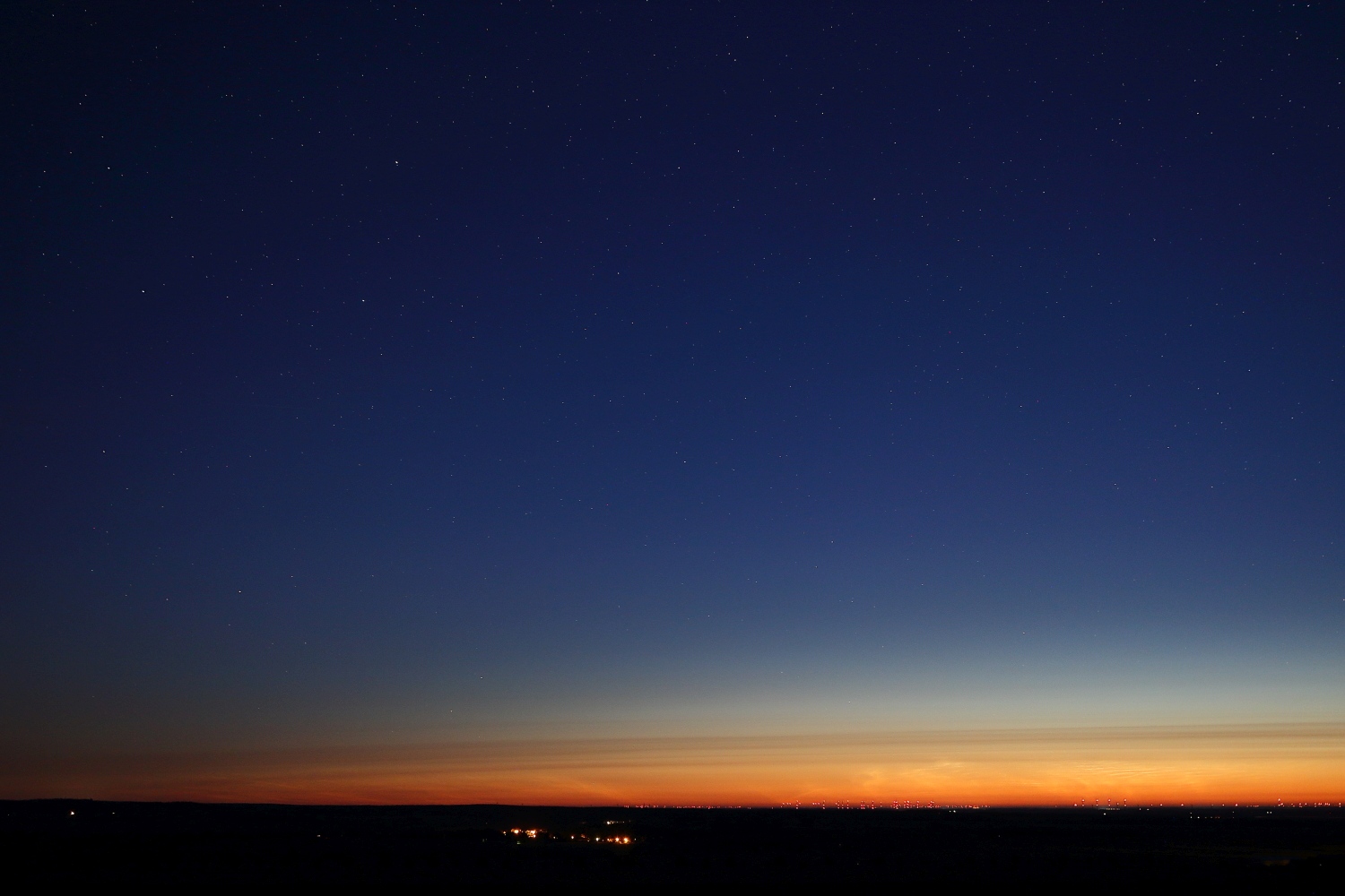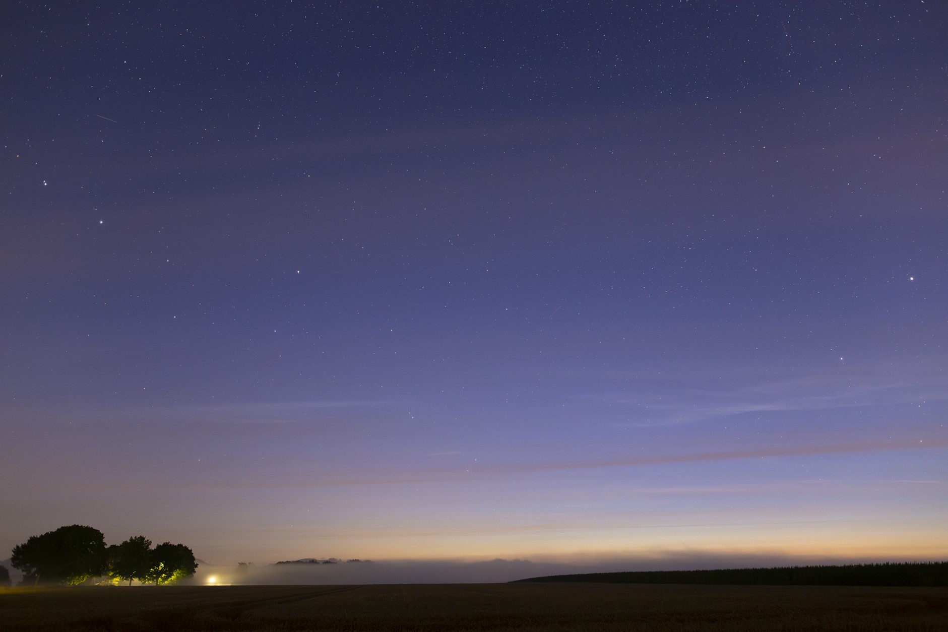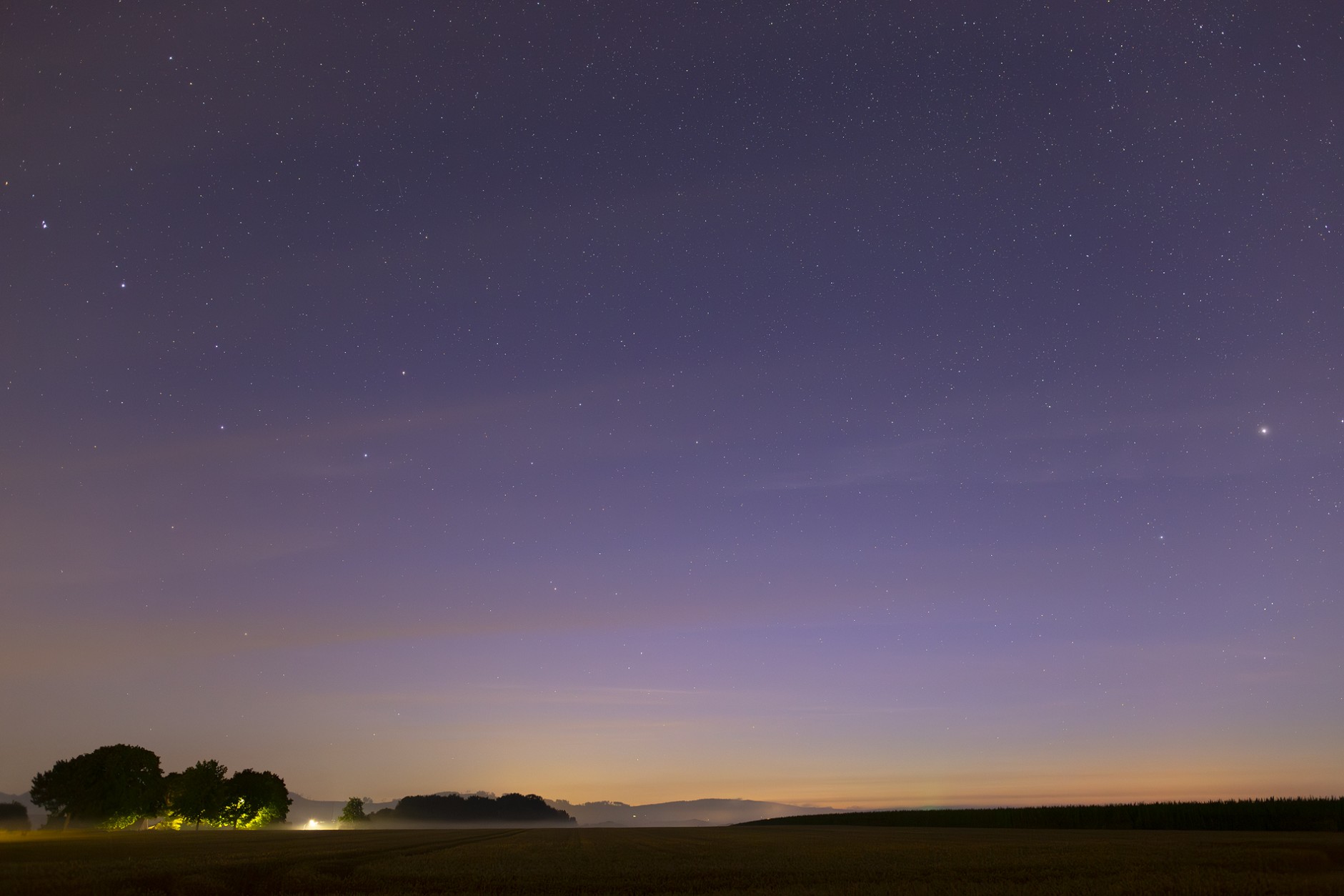 Ankunft auf einem Feldweg - Eine erste Aufnahme von 02:51 MESZ (Sonnenstand bei -14,6°) lässt klar und deutlich das Polarlicht in Form eines violett-rötlichen Glühen erkennen, wobei an dieser Stelle noch keine NLCs nachzuweisen waren: