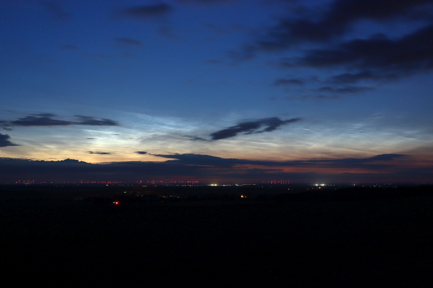 Ich konnte von meinem Standort auf dem Liebschützberg (51.35N, 13.13E) hinter immer wieder durchziehenden troposphärischen Wolkenfeldern im Morgensektor von 03:00 MESZ bis zu meinem Aufbruch eine Stunde später ebenfalls ein azimutal sehr ausgeprägtes Display in einigen Bereichen recht heller NLCs (H3) beobachten. Nachweise davon werde ich nach und nach hochladen: