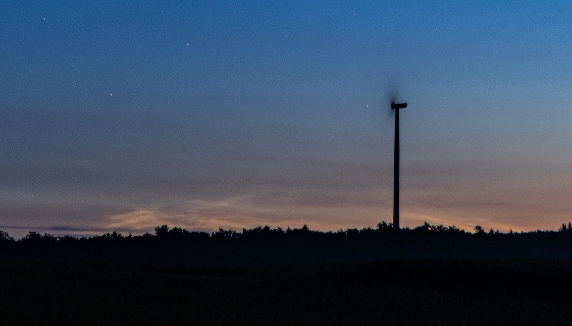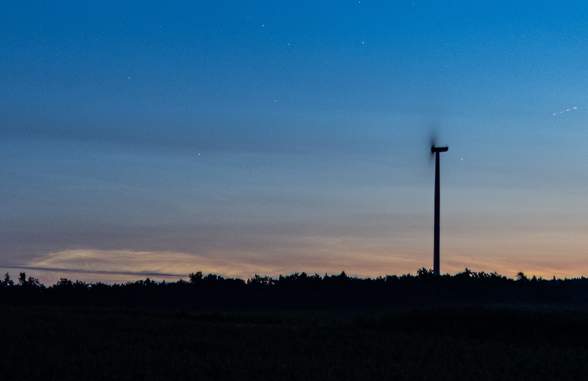 anbei mein Nachweis. Ich hatte ein wenig die Hoffnung gehabt, dass die NLCs, welche vorher im Norden sichtbar waren, noch etwas südwärts vorankommen. Angesichts des relativ guten Wetters brach ich zu meinem Beobachtungsort auf. Tatsächlich konnte ich dann NLCs nachweisen. Die standen sehr tief in Horizontnähe, waren aber gut mit bloßem Auge erkennbar. Anbei die Daten: