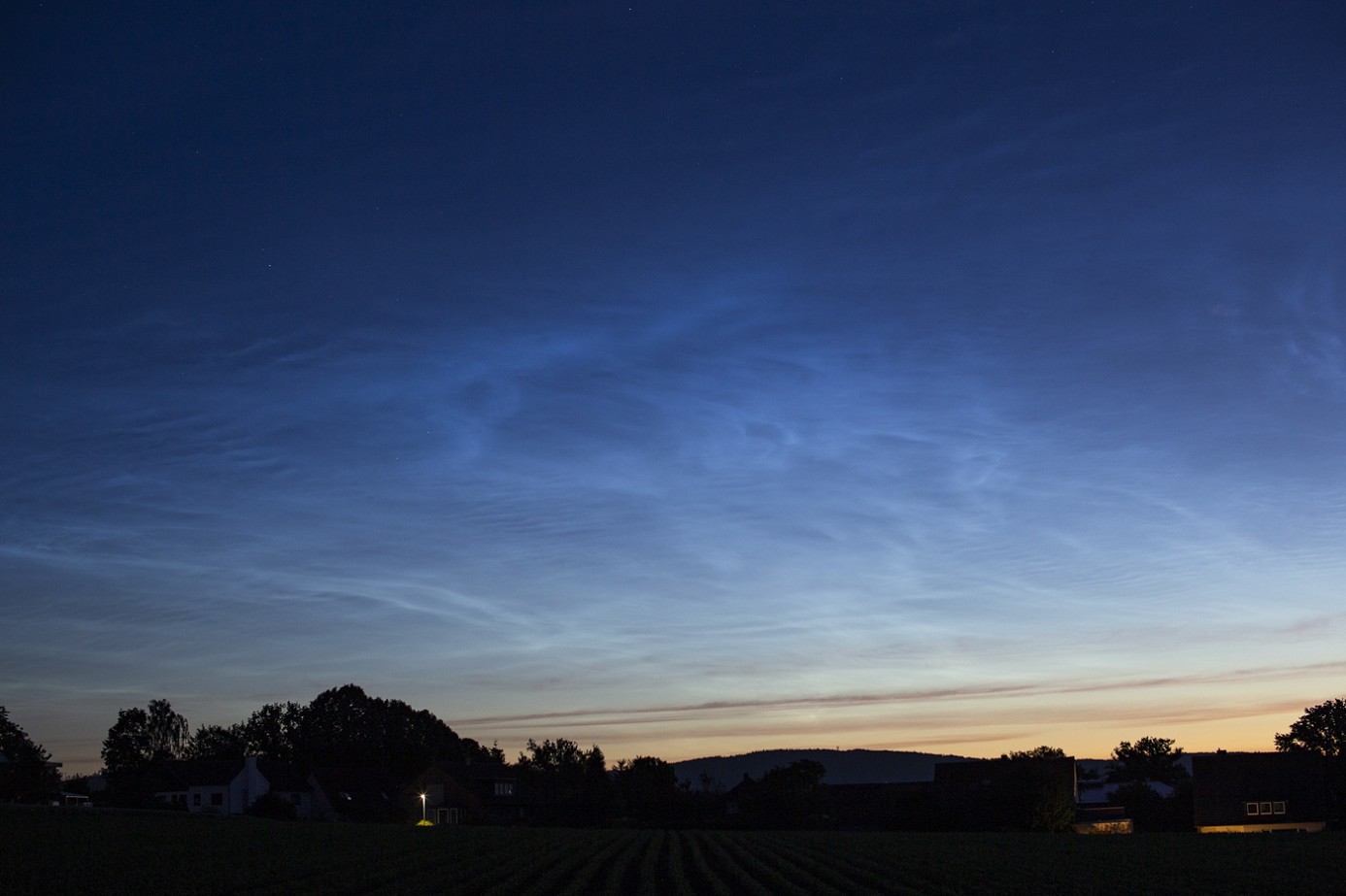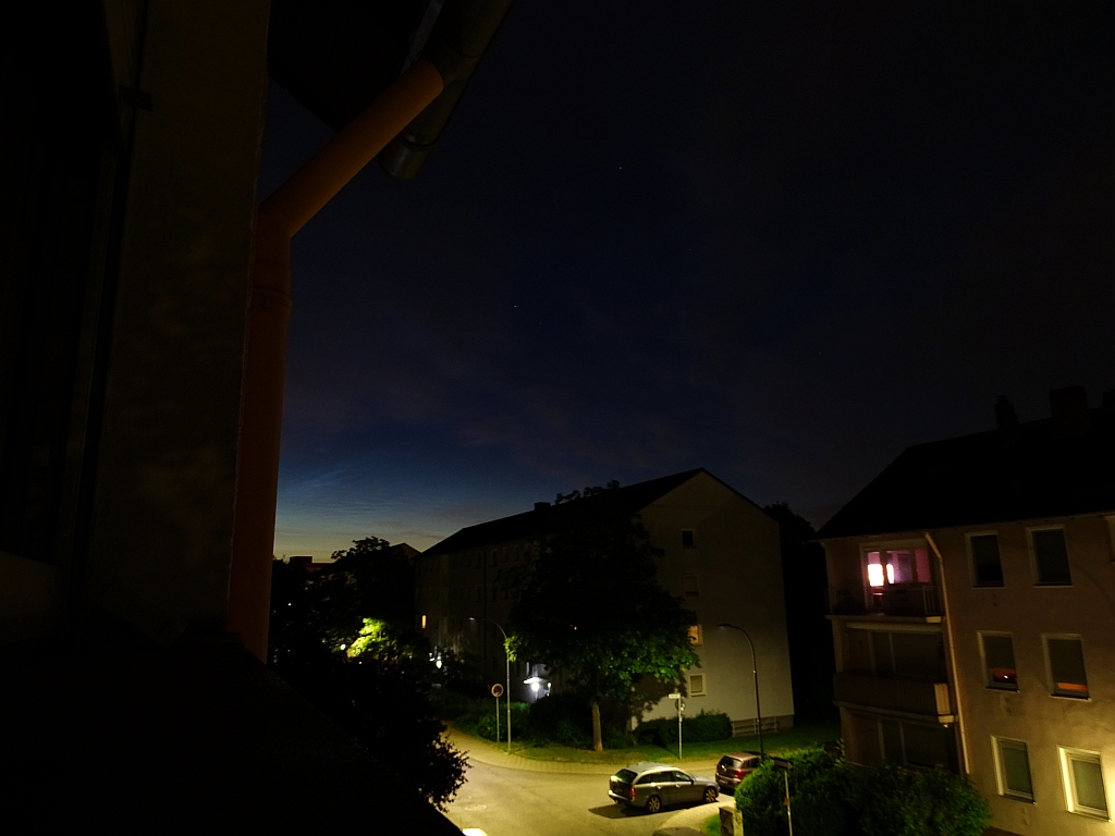 Kurz vorm Schlafen ging ich nochmal in den Garten. Zwischen Dächern und Bäumen deutete sich ein NLC-Feld an.