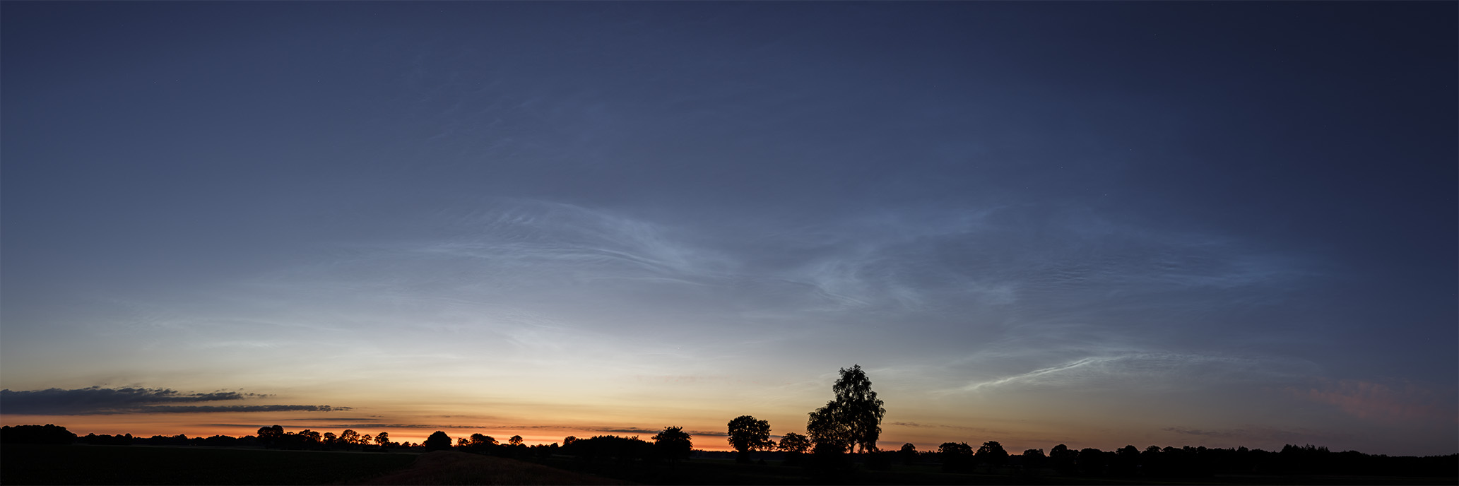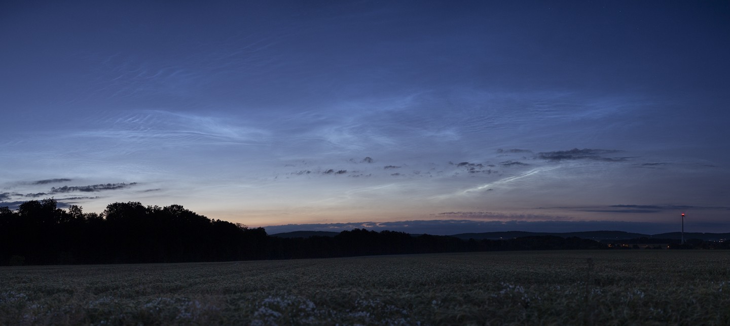 Der Anblick der NLCs wandelte sich schnell, die hochstehenden Strukturen vom Typ IIIa blieben dabei recht lange sichtbar. Dennoch wechselte ich auf ein 50mm-Objektiv, um ein detaillierteres Panorama des Horizonts anzufertigen: