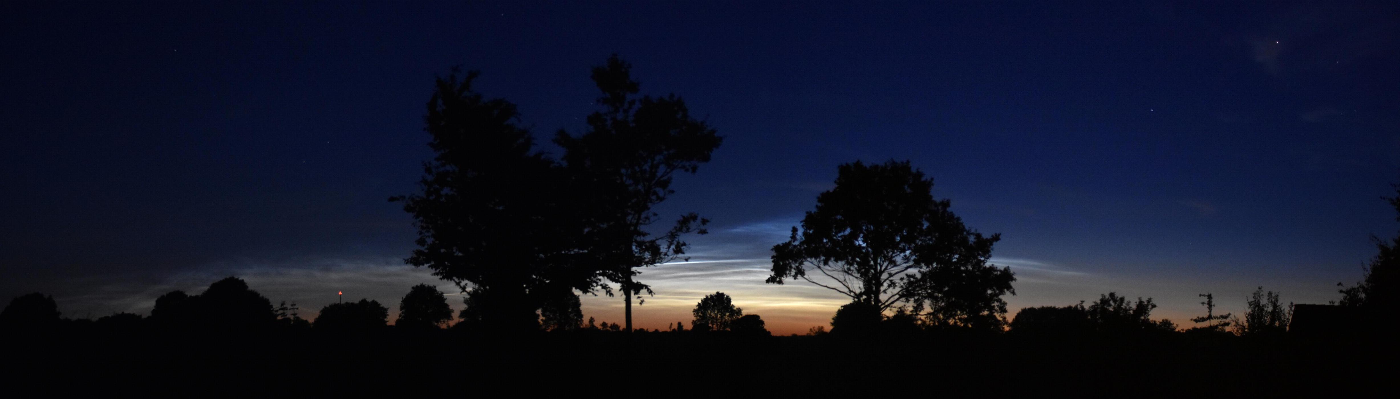 Im Norden waren nach 23:30 MESZ sichtbar. Ich habe nicht durchgängig beobachtet, jedoch waren dann immer NLC sichtbar. Seit einer halben Stunde werden sie im NNW deutlich heller, Höhe ca. 3° (links/rechts ist wegen Bebauung nicht einsehbar). Jetzt ziehen von der Nordsee die vorhergesagten Wolken rein und nur unterhalb vom Polarstern ist der Himmel noch frei. Deshalb bleibt es bei einem Motivationsfoto von 23:11.