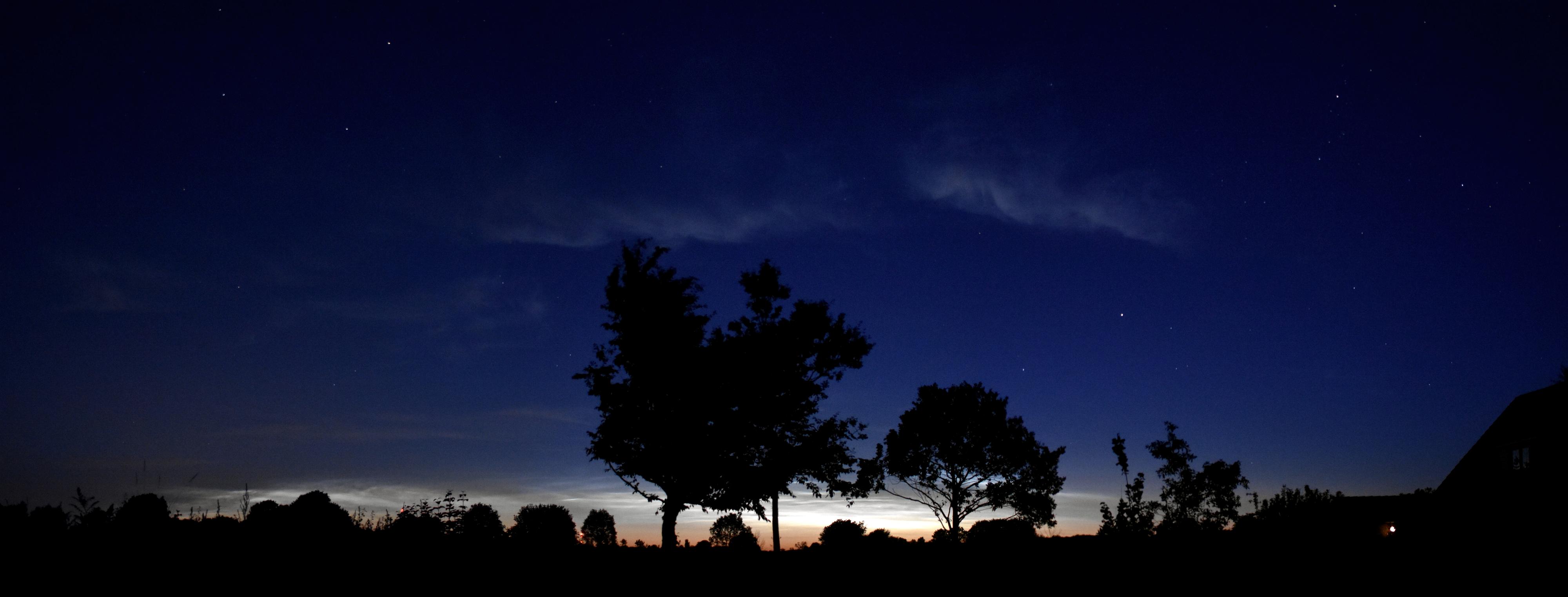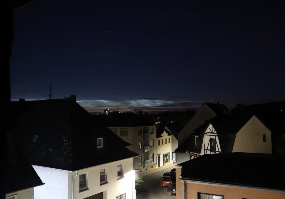 Im Norden waren nach 23:30 MESZ sichtbar. Ich habe nicht durchgängig beobachtet, jedoch waren dann immer NLC sichtbar. Seit einer halben Stunde werden sie im NNW deutlich heller, Höhe ca. 3° (links/rechts ist wegen Bebauung nicht einsehbar). Jetzt ziehen von der Nordsee die vorhergesagten Wolken rein und nur unterhalb vom Polarstern ist der Himmel noch frei. Deshalb bleibt es bei einem Motivationsfoto von 23:11.