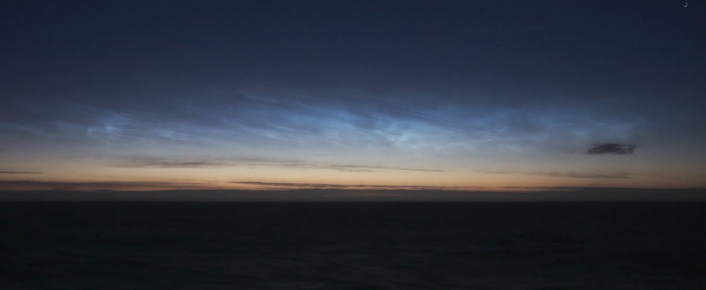 NLC zwischen Falklandinseln und Südgeorgien auf 51°48,5S, 56°15,7W. Leider 4m hohe Wellen, deshalb trotz sehr hoher ISO keine scharfen Bilder möglich. Zeit 22.30-23.00 OZ, Höhe 10°, Helligkeit 2, Richtung Süd (grob geschätzt), Ausdehnung 80°.