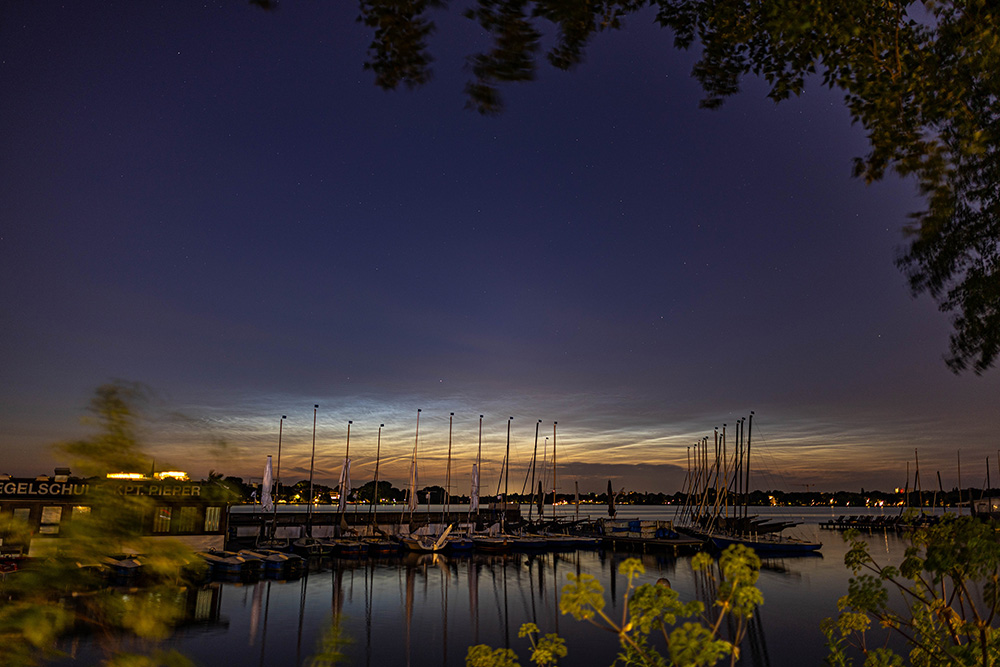 Die NLCs waren bereits kurz nach 22:30 Uhr sichtbar geworden als sehr schwache Streifen. Ich positionierte mich an der Außenalster in Hamburg, was für mich ein schöner Beobachtungsort mit tollen Motiv war (Wasser+Boote). Dort konnte ich dann ein recht ansehnliches Display beobachten, was schnell von Helligkeit 2 auf 3 anstieg. Die meisten NLCs endeten etwas über Capella in etwa 13° Höhe, zu Beginn konnte ich aber auch darüber noch schwache Strukturen ausmachen (zogen in die selbe Richtung wie die NLCs darunter), welche bis 35° gingen. Im Anschluss pendelte es sich bei knapp über Capella ein, sank im Verlauf dann auf etwas mehr als die Hälfte der Höhe von Capella ab. Was mich am meisten erstaunte war die Helligkeit, welche bis H4 anstieg. Selbst in der doch recht hellen Umgebung in Hamburg waren die Leuchtenden Nachtwolken sehr auffällig und die Strukturen klar sichtbar. Erst zum Ende hin nahm die Helligkeit wieder allmählich auf 3 ab. Gegen 1 Uhr beendete ich dann die Beobachtung aufgrund von Wolkenaufzug. Anbei ein paar Bilder: Ein Zeitraffer der NLCs gibt es hier: https://mbwetter.de/wetter/NLC/2025/NLCs_170625.mp4