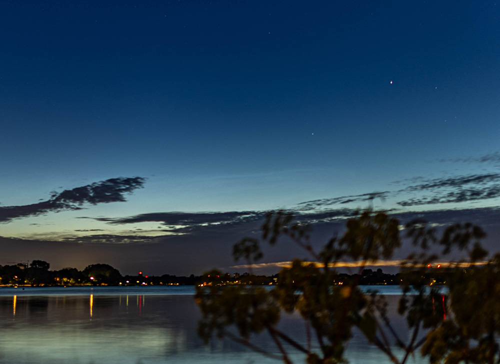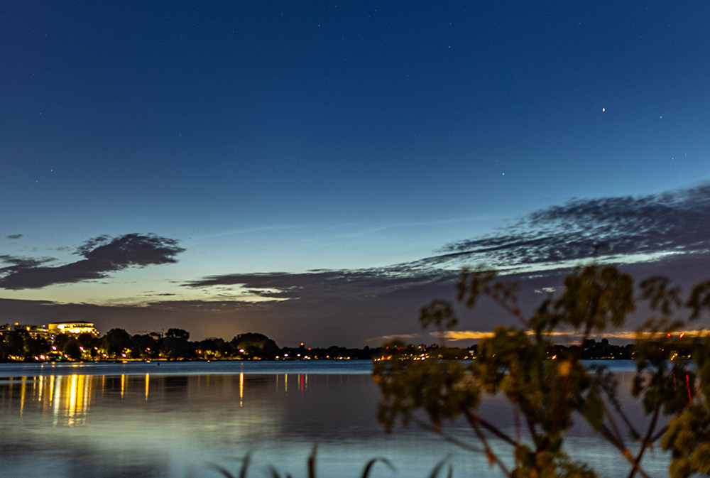 ich hatte mich wieder bei meinem üblichen Platz an der Alster in Hamburg positioniert. Die Beobachtung verlief leider sehr schwierig, da der Himmel die meiste Zeit mit Wolken überzogen waren. Gegen 0:46 MESZ hatte ich einen Verdachtsfall in einer Lücke gehabt: Eindeutig wurde es erst gegen 2:45 MESZ, als es mal etwas besser auflockerte. Da wurde dann ein NLC-Feld als Streifen sichtbar: Ob noch was unterhalb des Feldes war, konnte ich aufgrund der Bewölkung nicht sagen. Ein Video der NLC gibt es hier: https://www.mbwetter.de/wetter/NLC/2025/NLC_280625.mp4