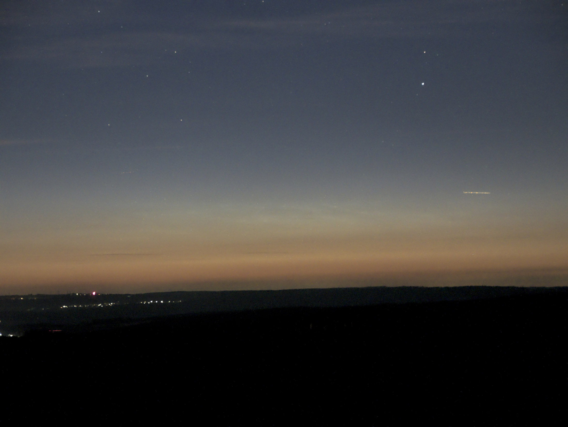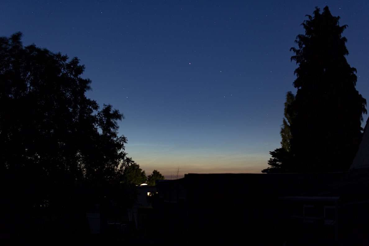 um kurz nach 2 Uhr (MESZ) haben die troposphärischen Wolken Platz gemacht und hier den Blick auf schwache NLCs freigegeben: