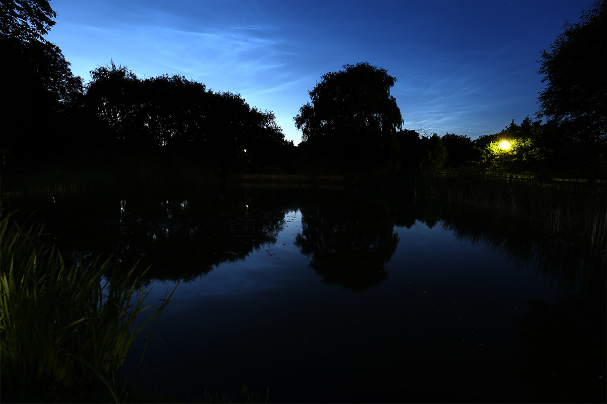Kurz darauf konnte ich die hochstehenden NLC auch noch über dem kleinen Weiher in Neuendorf ablichten, inklusive Spiegelung im Wasser, obwohl dieser Teich recht tief gelegen und von hohen Bäumen umgeben ist.