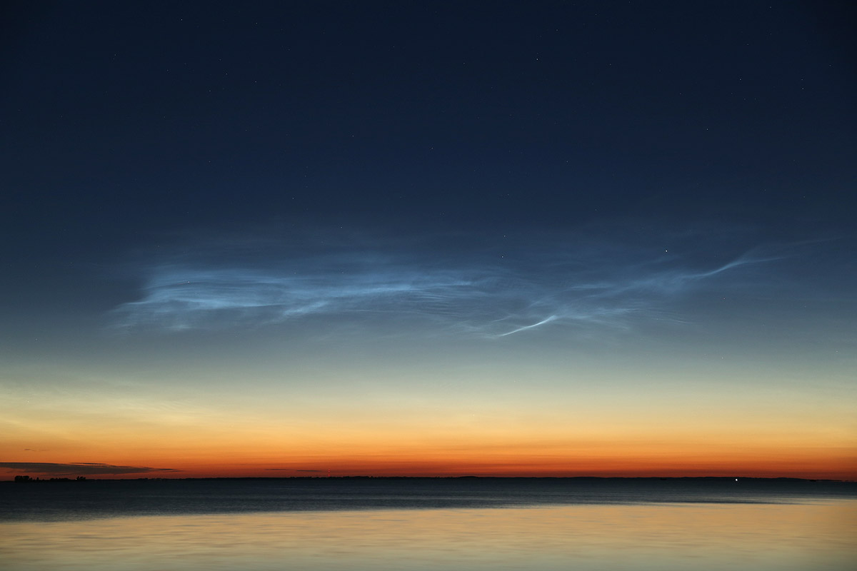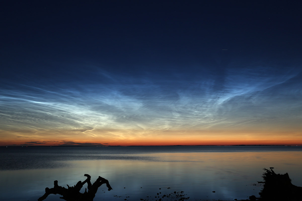 Die Nacht vom 17. auf den 18. Juni 2019 begann mit einem Paukenschlag. Ich hatte mich aufgrund der guten Wetterbedingungen und hervorragender Aussichten auf leuchtende Nachtwolken auf eine Radtour zur anderen Seite des Greifswalder Boddens begeben und konnte schon etwa 20 Minuten vor 23:00 Uhr hoch stehende Wolkenstrukturen erkennen, bei denen ich mir allerdings noch nicht hundert Prozent sicher war, ob es sich dabei auch wirklich um leuchtende Nachtwolken handelte.