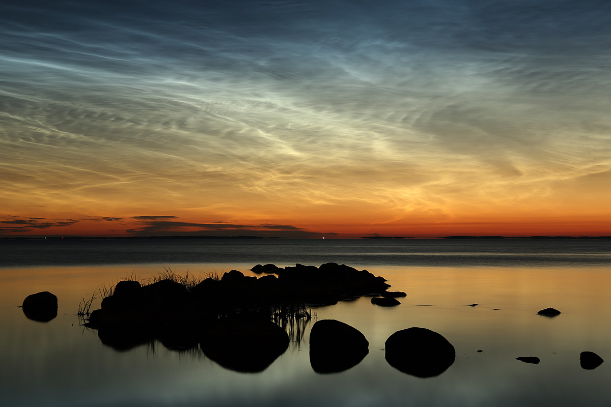 Diese beiden Displays begannen bald zu verblassen. Gleichzeitig wurden etwa ab 00:00 Uhr am Horizont anfangs sehr schwache und horizontnahe NLC sichtbar, die im Laufe der Nacht immer kräftiger wurden und immer höher stiegen. Ab etwa 00:30 waren sie auch fotografisch relevant, ab 01:00 hatte sich bereits ein breites NLC Feld gebildet das nun immer höher stieg. Bild 9 ist das letzte von diesem Strandabschnitt, den höheren Blendenwert und ISO habe ich genutzt, um auch den Vordergrund scharf zu bekommen.