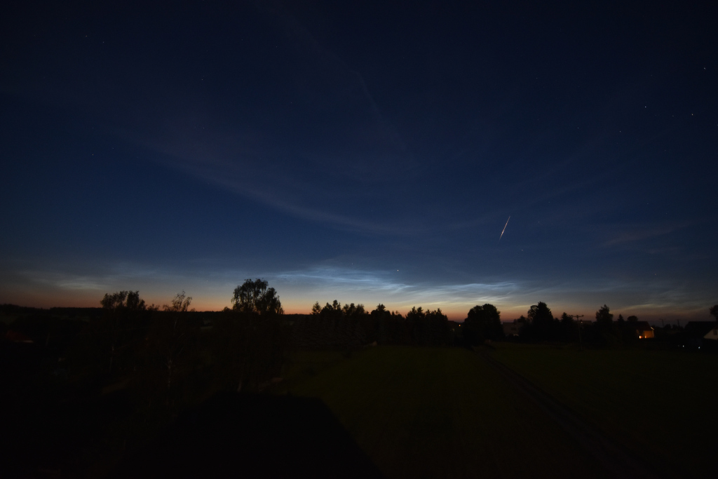 Die Ausdehnung dieses frühen NLC Feldes reichte etwa von Westen über den Norden bis in den Osten und die Wolken standen hoch bis in den Zenit. Dieses frühen NLC hatten eine relativ geringe Leuchtstärke, was ich aber eher auf die frühe Uhrzeit zurückführen möchte, denn der Hintergrund war noch ziemlich hell. Ich konnte zwischen 23:05 und 23:23 an zwei Stellen in Kemitz einige Bilder von diesen hochstehenden NLC machen, danach löste sich ein Großteil bis etwa 23:35 recht schnell wieder auf.