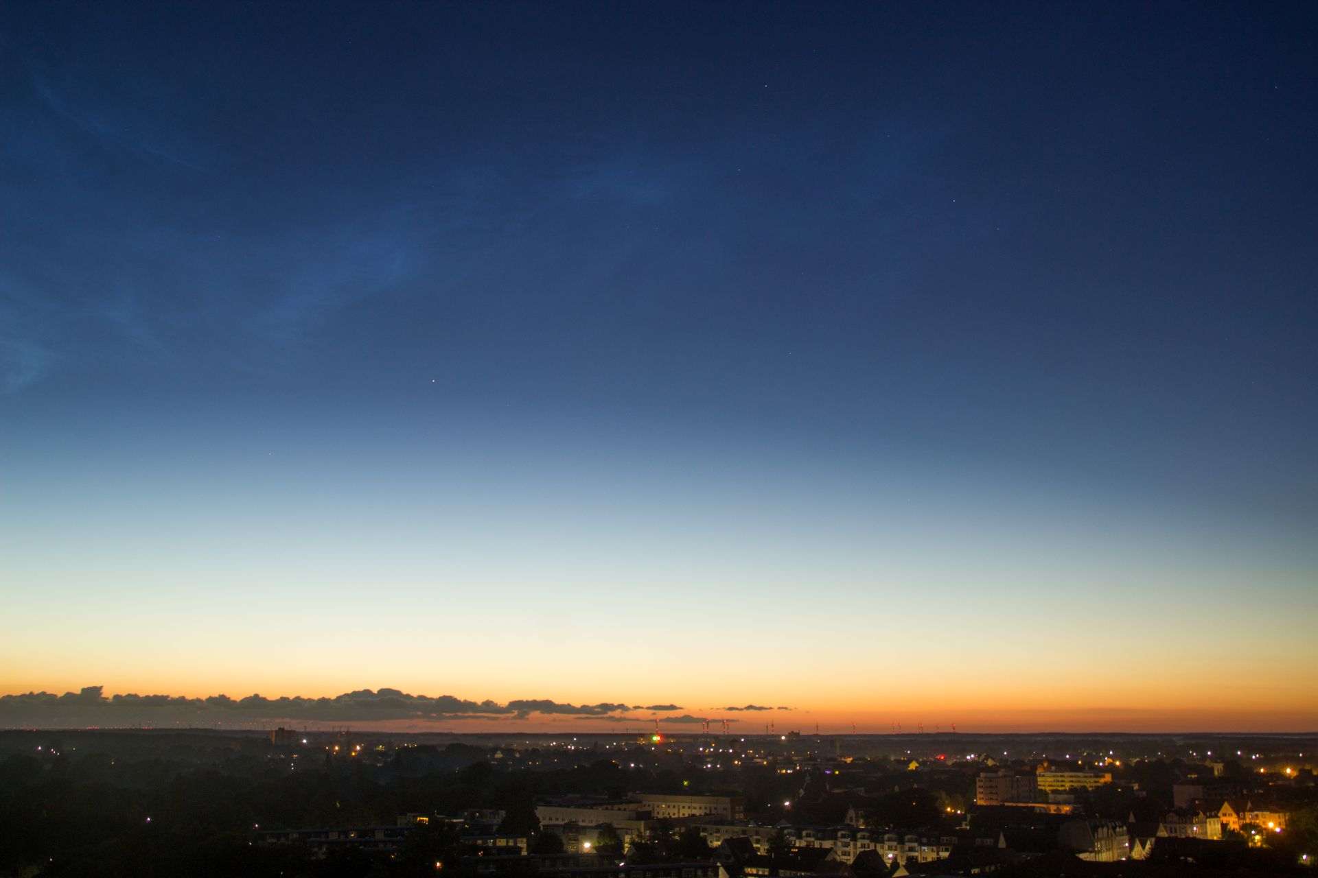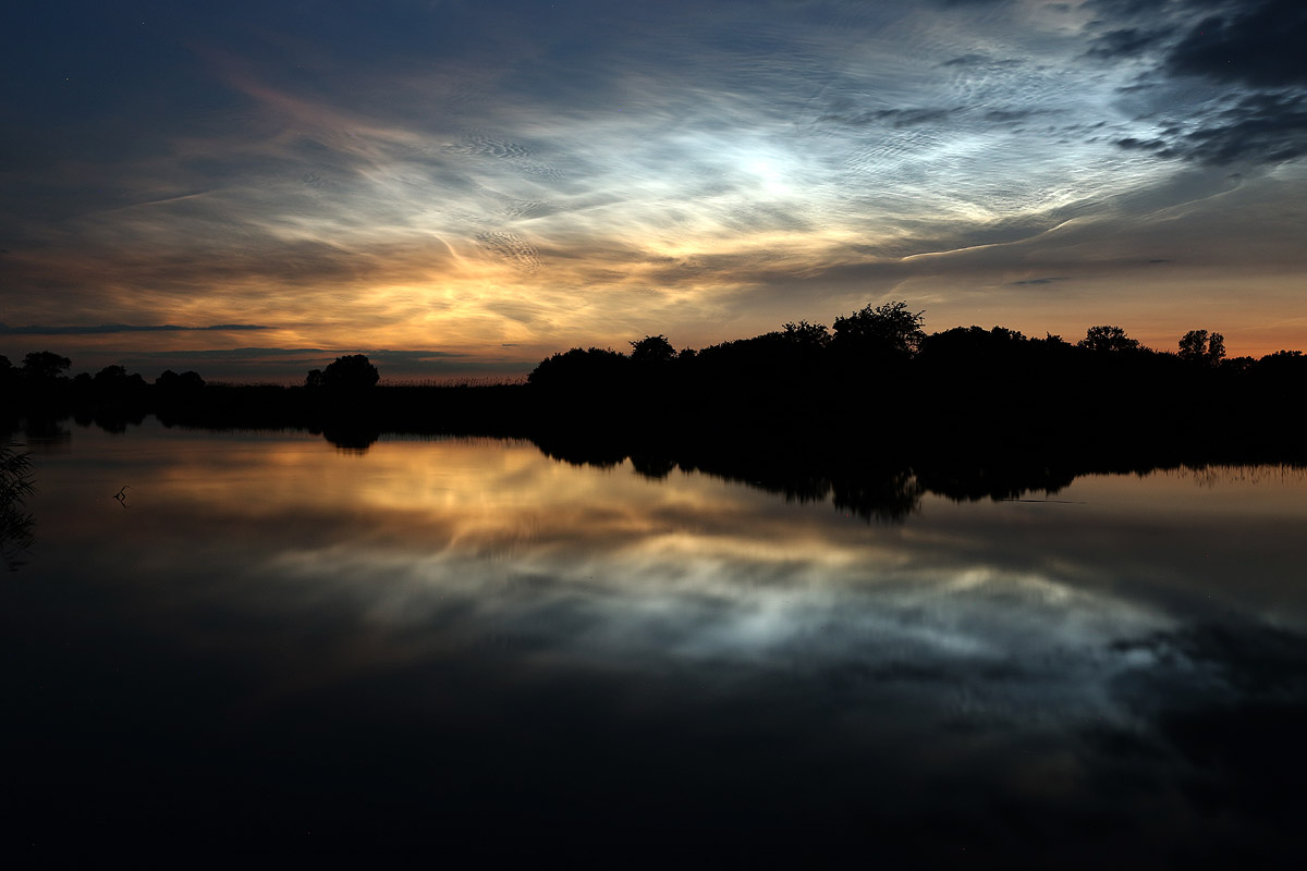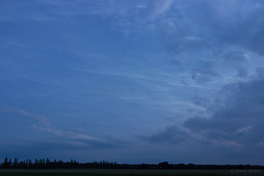 Im Internet konnte ich dann auch schon von großen Displays weiter südlich in Deutschland lesen, was meine Vermutung bestätigte, das es sich hier tatsächlich um NLC handelte. Ich zog mich also unerwartet schnell an und radelte eilig zum Ryck, weil das der nächst gelegene Ort mit freiem Blick nach West, Nord und Ost ist. Auf der kurzen Fahrt konnte ich in Wolkenlücken über mir die NLC gut und eindeutig erkennen, aber als ich dann am Ryck ankam, war von den NLC nichts mehr zu sehen oder zu fotografieren, die letzten Lücken in den Wolken hatten sich komplett geschlossen.