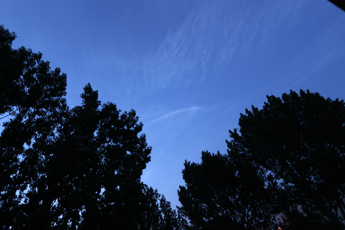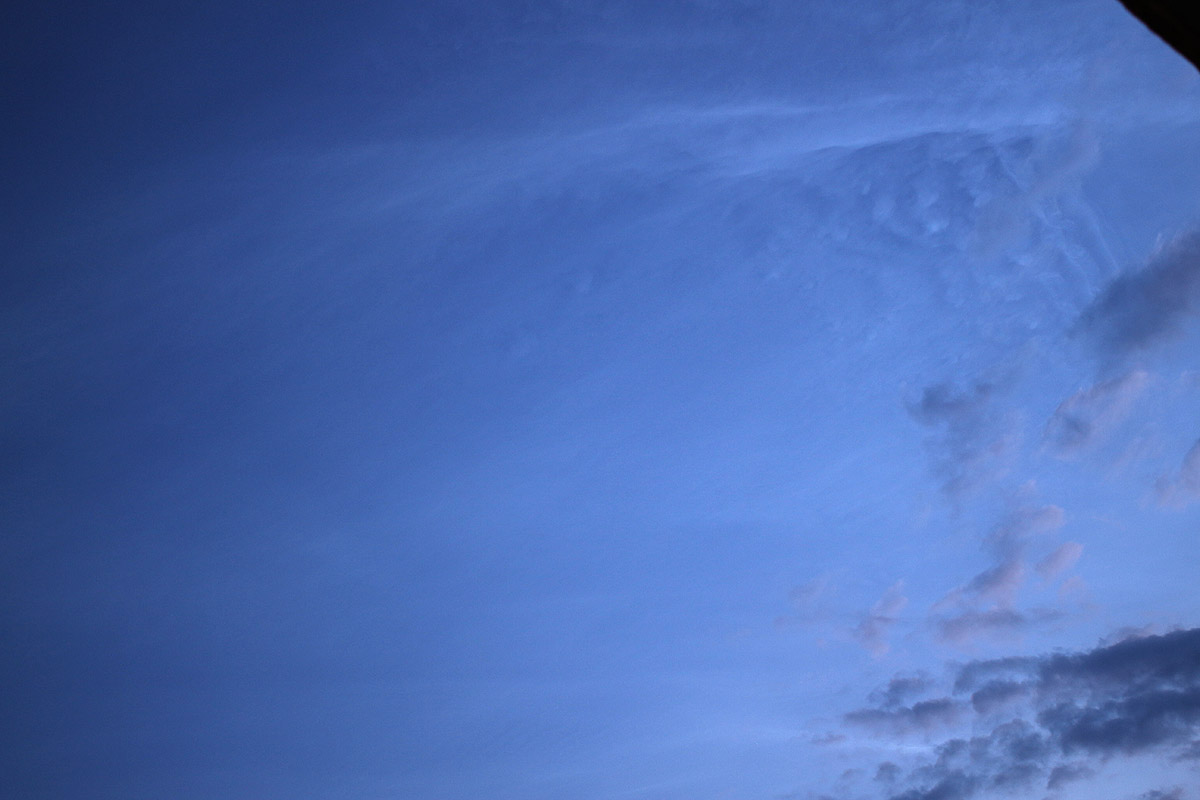 Die Nacht vom 21 auf den 22 Juli begann für mich sehr unerwartet und stressig. Aus Richtung Südwesten zeigten verschiedene Wetterdienste eine heranziehende Wolkenfront, unabhängig davon hatte ich trotzdem alles für die NLC Beobachtung vorbereitet und überwachte die üblichen Webcams, auf denen zu diesem Zeitpunkt nichts zu sehen war. Als ich am Balkon mal wieder nach der heranziehenden Wolkenschicht sehen wollte, erblickte ich senkrecht über mir Strukturen, die NLC zu sein schienen und die auch die typische silberbläuliche NLC Farbe hatten. Ich machte dann mehr schlecht als recht ein paar Fotos mit meiner kleinen Kamera (es ist nicht so leicht, auf einem Balkon möglichst senkrecht nach oben zu knipsen). Beide Aufnahmen sind alles andere als fotografisch spektakulär, aber sie zeigen, wie ungewöhnlich diese NLC Nacht begann.