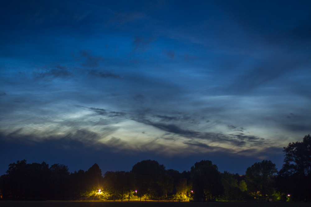 Später zeichneten sich noch ein paar troposphärische Wolken dunkel vor den NLCs ab.