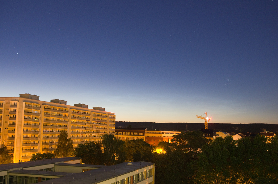 ich habe in der vergangenen Nacht zunächst die Sulecin-Cam beobachtet und mich dann erst gegen kurz nach zwei MEZ dazu durchringen können, noch mal raus zu fahren. Trotz des Berliner Lichtermeers waren die Wolken gut zu sehen, verblassten dann aber recht schnell. Ausdehnung war recht beeindruckend, wobei vielleicht auch zwei Felder zu beobachten waren.