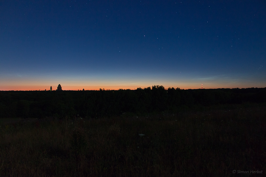 nachdem die Sauerland-Cams ab 02:50 Uhr schwache NLCs zeigten, bin ich sofort rausgefahren. Um 03:15 Uhr war ich an meinem Beobachtungsort, wo mich ein recht unauffälliges NLC-Display (Azimut 353° - 15°, Höhe 3° bei Az. 353° bis 5° bei Az. 15°; Helligkeit 1) erwartete. Zu diesem Zeitpunkt betrug die Sonnendepression 13°. 15 Minuten später, bei Beginn der nautischen Dämmerung um 03:31 Uhr (Sonnendepression 12°), waren die NLCs bereits fast vollständig im heller werdenden Dämmerungsbogen verblasst.