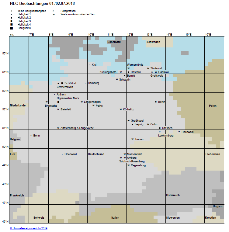 die NLCs der Nacht 01./02.07.2018 sind durch zahlreiche Beobachtungen hervorragend belegt (Abb. 1). Dazu trug neben dem in ganz Miteleuropa blitzblanken Himmel (Abb. 2) sicherlich (im Hinblick auf die menschlichen Beobachter) auch bei, dass es sich um die Nacht Freitag/Samstag handelte. Daher konnten viele bis in die Morgenstunden durchhalten, als das insgesamt nicht allzu eindrucksvolle Display seine beste Entwicklung und zumindest im Nordwesten die Helligkeit 3 erreichte. Dank erfreulich vieler Angaben zu Azimut und Höhe lässt sich die Lage des NLC-Feldes gut rekonstruieren (Abb. 3). Die hierfür verwendeten Daten decken den Zeitraum zwischen 00:26 und 03:15 MESZ ab. Somit gibt Abb. 3 also den Aufenthaltsraum der Südkante des Feldes im genannten Zeitabschnitt wieder. Da das Display auch mit fortgeschrittener Morgendämmerung nirgends höher als 18 Grad stieg, ist in diesem Fall nicht nur die sichtbare (durch den Terminator in der Mesopause-Region) bedingte Südkante, sondern die tatsächliche physikalische repräsentiert.