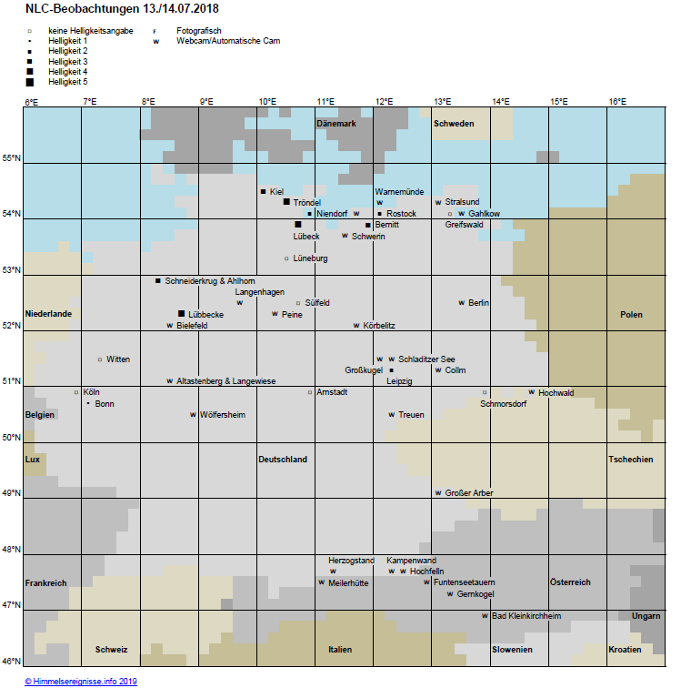 am 13.07.2018 begann ein markanter "Outbreak" Leuchtender Nachtwolken, welcher in 3 aufeinanderfolgenden Nächten (13./14.07., 14./15.07. und 15./16.07.18) helle bis sehr helle Displays hervorbrachte, die jedoch lediglich im deutschen Küstengebiet in voller Pracht zu sehen waren. Nur in der ersten der drei genannten Nächte gelangen - ausschließlich im Morgensektor und an automatischen Webcams - Nachweise bis ins Alpengebiet (Abb. 1). Die etwas unregelmäßige Verteilung der Beobachtungsorte in Abb. 1 spiegelt die Witterungsverhältnisse (Abb. 2) wieder, welche durch Hochnebel im Nordseegebiet und Wolken sowohl in Teilen Süddeutschlands gekennzeichnet waren. Erschwerend kam für etwaige Beobachter im Südwesten hinzu, dass der Schwerpunkt des NLC-Feldes über der Ostsee lag (Abb. 3); erst zum Morgen hin zogen die NLCs etwas mehr nach Westen. Damit einher ging eine Verlagerung nach Süden bis fast an die deutsche Ostseeküste, wodurch die Webcam-Beobachtungen im Alpengebiet möglich wurden. Die NLCs erreichten ihre größte Helligkeit in zwei Phasen, gegen 24 Uhr und gegen 3 Uhr, während sie sich um die Zeit der astronomischen Mitternacht merklich abschwächten.