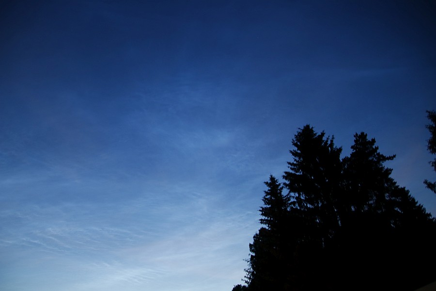 aus Wien vom Bisamberg aus (Breite 48,3°) war es ziemlich wolkenverschleiert, aber die hellsten Sterne waren sichtbar. Die NLCs waren freisichtig als deutliche Aufhellung erkennbar. Mit der Kamera war mehr erkennbar (Canon 600D, f=24mm 1:4).