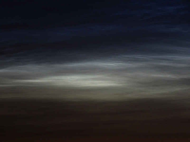 In der Früh um 03:00 Uhr Beobachtungsbeginn bei schon sichtbaren NLC. Dieses doch nocht kleine, aber schon recht helle Feld, dehnte sich zusehends nach allen Richtungen aus.