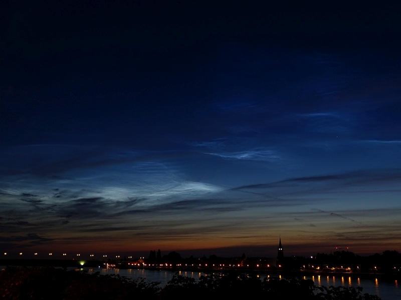Im Laufe der Nacht war mittels diverser Webcams bereits absehbar, dass ein beachtliches NLC-Feld aufzog. Die rötliche Oberkante versprach eine Sichtbarkeit bis in den Bonner Raum. Was ich dann ab etwa 03:20 MESZ am Rheinufer sehen konnte, war ein in in großen Teilen nicht sehr auffälliges NLC-Feld mit einem überragenden Helligkeitsschwerpunkt (Abb. 1, 2). Zwar war eine Spiegelung im Rhein nicht festzustellen, aber auf Grund der zeitweise sehr großen Helligkeit dieses Bereichs - auch im Vergleich zu anderen "großen" Displays, die ich in der Vergangenheit gesehen habe - ist die Helligkeit mit "5" anzugeben. Im Laufe der Zeit (ich blieb bis etwa 04:05 MESZ vor Ort), entwickelten die lichtschwächeren Teile des Displays durchaus interessante Strukturen (Abb. 3, 4).