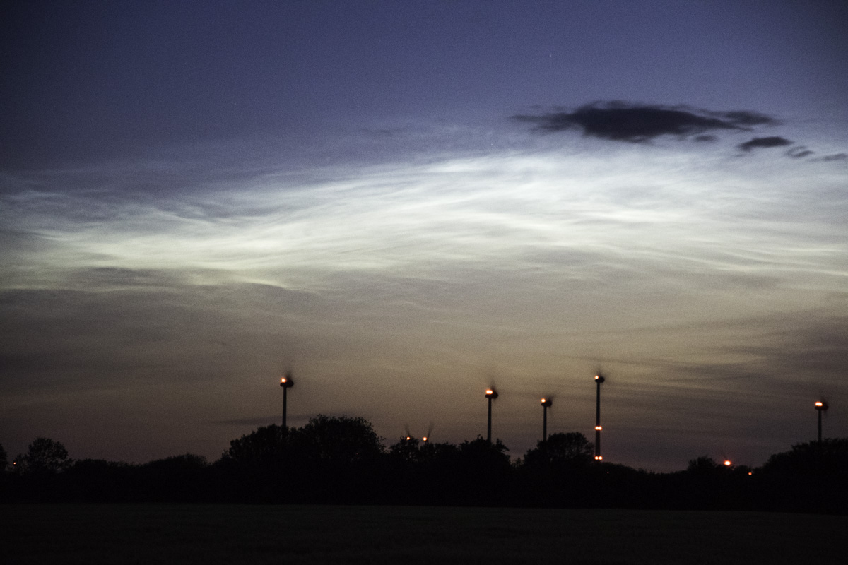 Rechts davon lungerte ein Wolkengebiet wo immer wieder helleren Flächen zu sehen waren. Im Norden zog ein zweites Wolkengebiet zügig westwärts und gab den Blick auf die dahinter liegenden NLC frei. Leider habe ich in dem entscheidenden Moment die Kameraposition nicht nachgerichtet, so dass die NLC nach links aus dem Bild liefen. Dieses Moment habe ich nicht nur sprichwörtlich verschlafen.