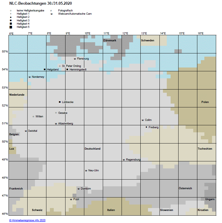 die Nacht 30.05./31.05.2020 brachte nicht nur der D/A/CH-Region, sondern dem gesamten europäischen Raum die ersten wirklich bemerkenswerte NLC-Displays der Saison 2020. Nach sehr verhaltenem Beginn im Abendsektor war damit zumindest bei uns nicht unbedingt zu rechnen. Doch dann tauchte im Morgensektor (Abb. 1) ein auf Grund der Horizontnähe und der westlichen Position gold-gelb leuchtendes Display auf, das die Aufmerksamkeit der Beobachter auf sich zog. Letzteres so sehr, dass einigen fast ein zweites, völlig getrenntes Display entging, welches recht hoch stehend in östlicher Richtung binnen kurzer Zeit aus dem Erdschatten trat. Es hielt sich über dem Nordwesten Deutschlands auf (Abb. 3) und erschien den dortigen Beobachtern lichtschwächer als das horizontnahe Feld. Im Kantenblick, z.B. von Webcams in den Alpen (Beispiel: https://www.foto-webcam.eu/webcam/dornb ... 05/31/0350), erwies es sich aber ebenfalls als recht leuchtkräftig (sofern sich das an Hand von Webcam-Bildern feststellen lässt). Durch genaue Ausmessung der Fotos aus Lübbecke würde sich wahrscheinlich die gesamte Ausdehnung des zweiten Feldes feststellen lassen, welches offenbar eine klare nördliche Begrenzung besaß.