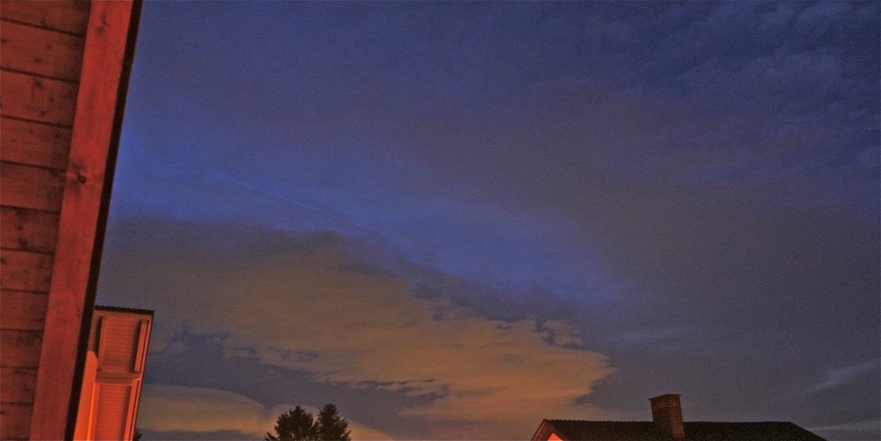 Das Regengebiet hatte sich glücklicherweise den Tag zum abregnen ausgesucht, so dass dahinter klare kalte Luft einfliessen konnte. "Oswin" ließ es ja bereits vermuten: da tut sich was in Sachen NLC. Bereits gegen 20:50 UTC (!!) konnte ich NLC-Strukturen von der Terrasse aus sehen. Habe dann schnell noch ein paar Belegfotos gemacht (s.u, aufgenommen mit 20mm) :