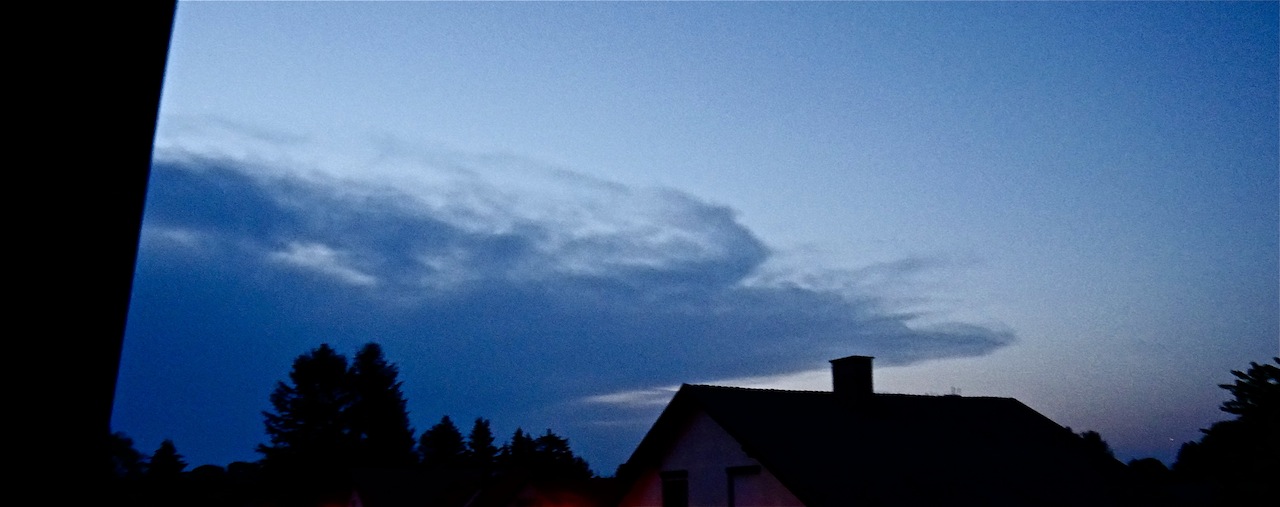 Moin aus dem Wiener Becken, 30Km südl. v. Wien hat sich gestern Abend gegen 22h dieses unverkennbar elektrisch blaue Licht über einen CB gezeigt, dessen vorauseilender Schirm direkt von Nord her schier durchdrungen wurde, die NLC´s als solche sieht man nicht, aber dieses intensive Licht hinter dem CB war konstant, kein Wetterleuchten, keine Lichtstrahlung von unten, das sieht anders aus. Es muss ein sehr intensives Display dahinter gesteckt haben. Die Aufnahme des Cb´s in noch heller Dämmerung im Norden entstand eine halbe Stunde früher also gegen 21:30h.
