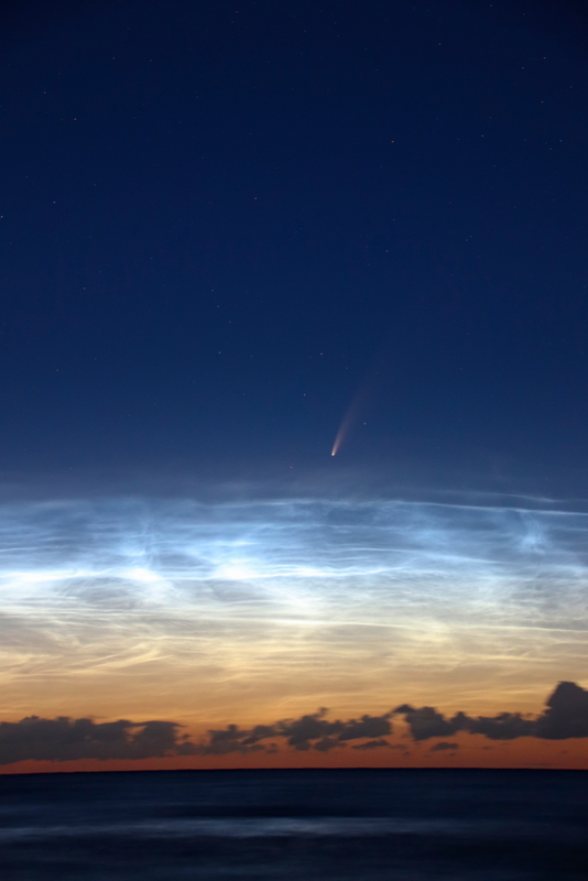 Zu meiner Überraschung verblassten die NLC sehr schnell, um 21:10 UTC konnte ich nichts mehr erkennen. Ich entschied mich, nicht gleich 'rauszufahren, sondern ein wenig zu schlafen. Gegen 0:00 UTC wollte ich an der Ostsee zu sein (sind nur 5 min. Autofahrt). Schon auf der Fahrt dorthin sah ich Neowise über den hellen NLC's ...mehr geht nicht. Der Rest wurde hier bereits beschrieben und mit tollen Bildern ergänzt...
