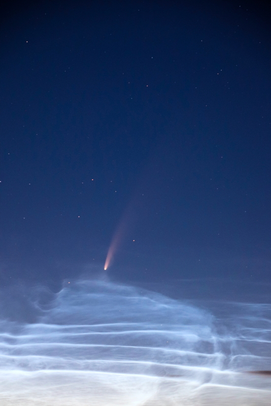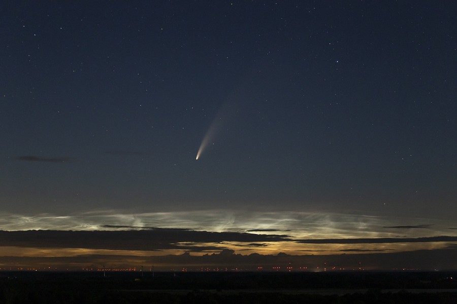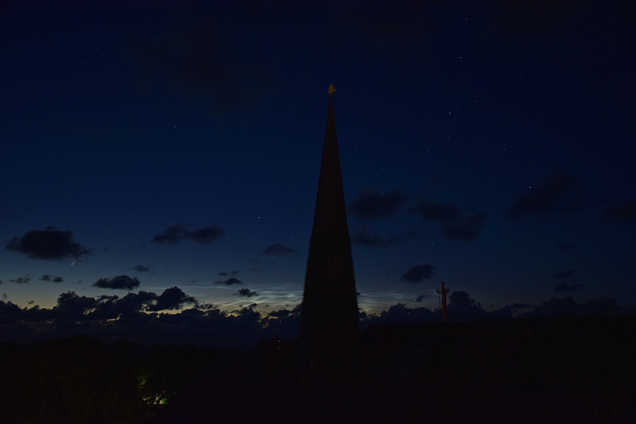 Nach einigen vielen Fotos von Neowise waren aber inzwischen auch die Wolken vor den NLC weggezogen. Sie waren sehr horizontnah, aber verdammt hell (H 4). So bin ich also noch länger geblieben und konnte noch richtig stimmungsvolle NLC mit Kometen beobachten.