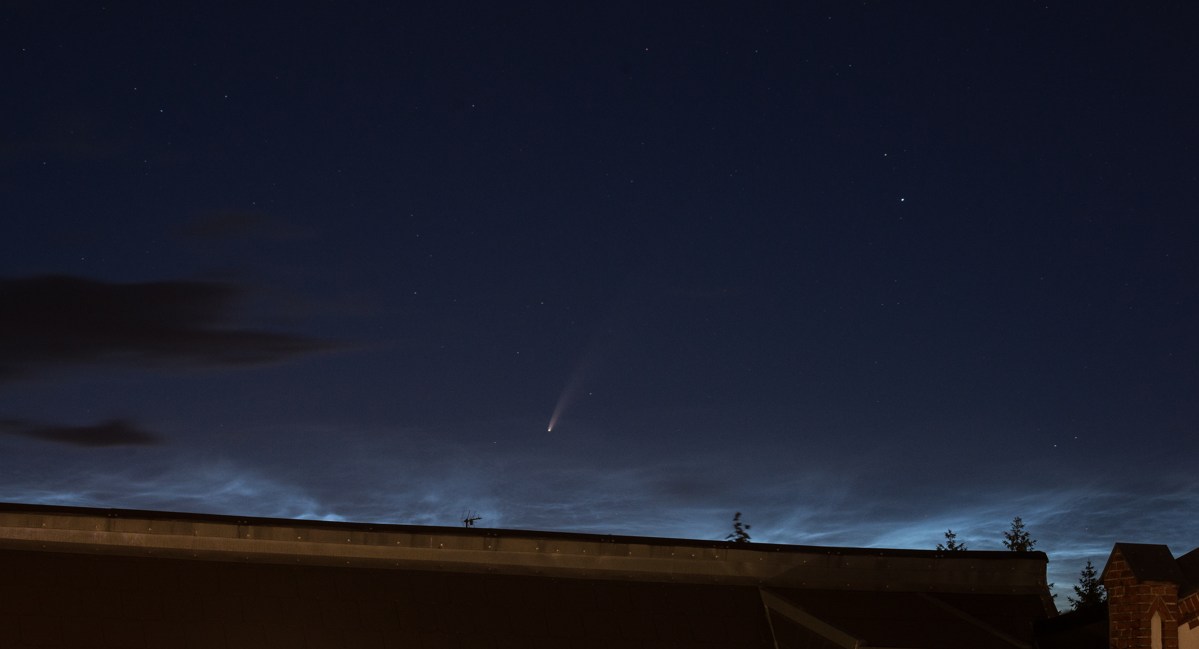 Das hohe NLC-Feld (Feld1) verblasste dann auch recht schnell, während sich parallel (ab ~23 Uhr MESZ) ein horizontnahes Display (Feld2) abzeichnete. Diese Allnight-Erscheinung, bei einer maximalen Helligkeit 3, konnten wir die gesamte Nacht hinweg, zusammen mit NEOWISE, beobachten. Hier ein Bild zum ungefähren Zeitpunkt der lokalen Mitternacht: