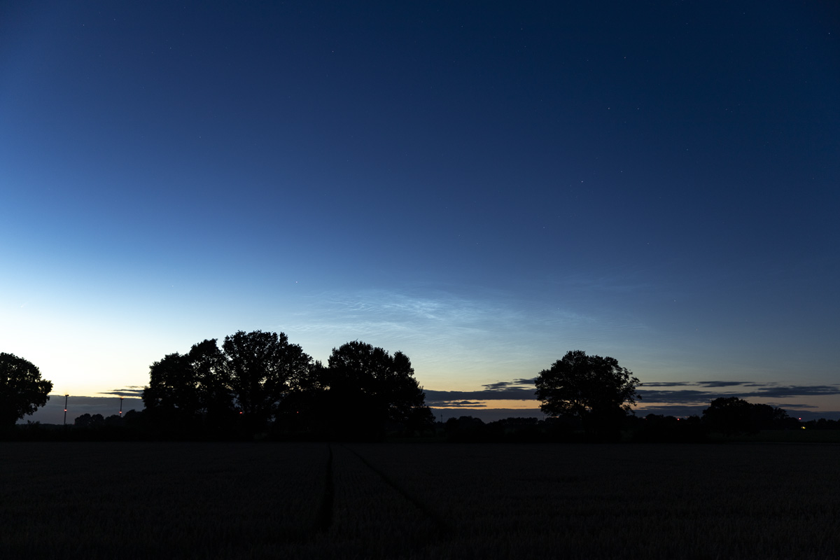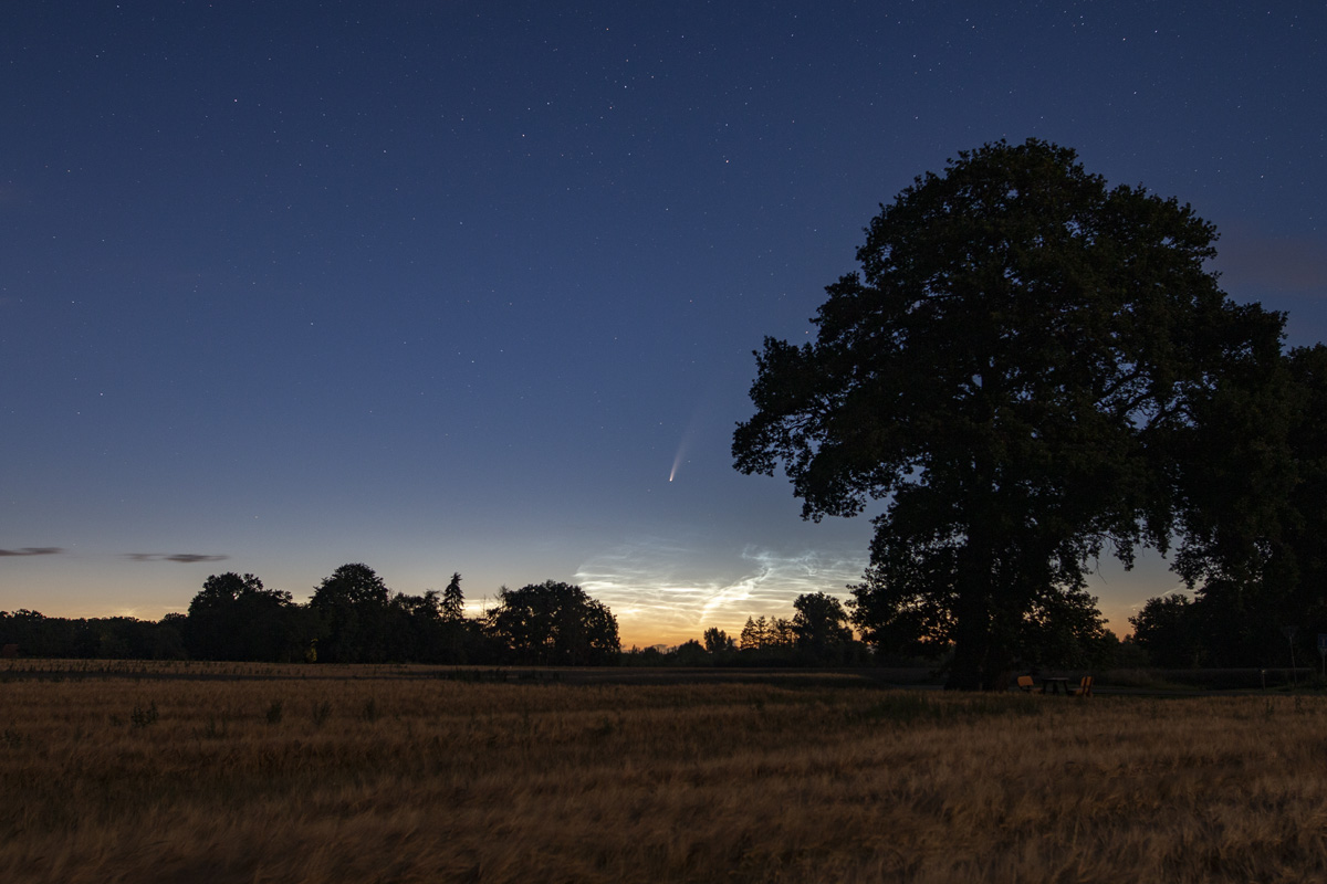 Ein wenig enttäuschend war das schon. Aber zumindest konnte ich mich jetzt auf Neowise konzentrieren. Hier habe ich einige Zeit verbracht, Fotos zu machen, um dann später noch einmal den Standort zu wechseln. Ich hatte einen bestimmten Baum vor Auge, neben dem sich Neowise ganz gut machen würde. Leider gab es bis auf quer durch ein Weizenfeld keine Möglichkeit, Baum und Komet auf ein Foto zu bekommen. So bin ich dann an meinen Standardbeobachtungsort gefahren, weil es da auch ein paar hübsche Bäume gibt. Die NLC waren immer noch zu sehen, wenn auch zum größten Teil hinter Wolken. Daher waren sie ziemlich uninteressant.