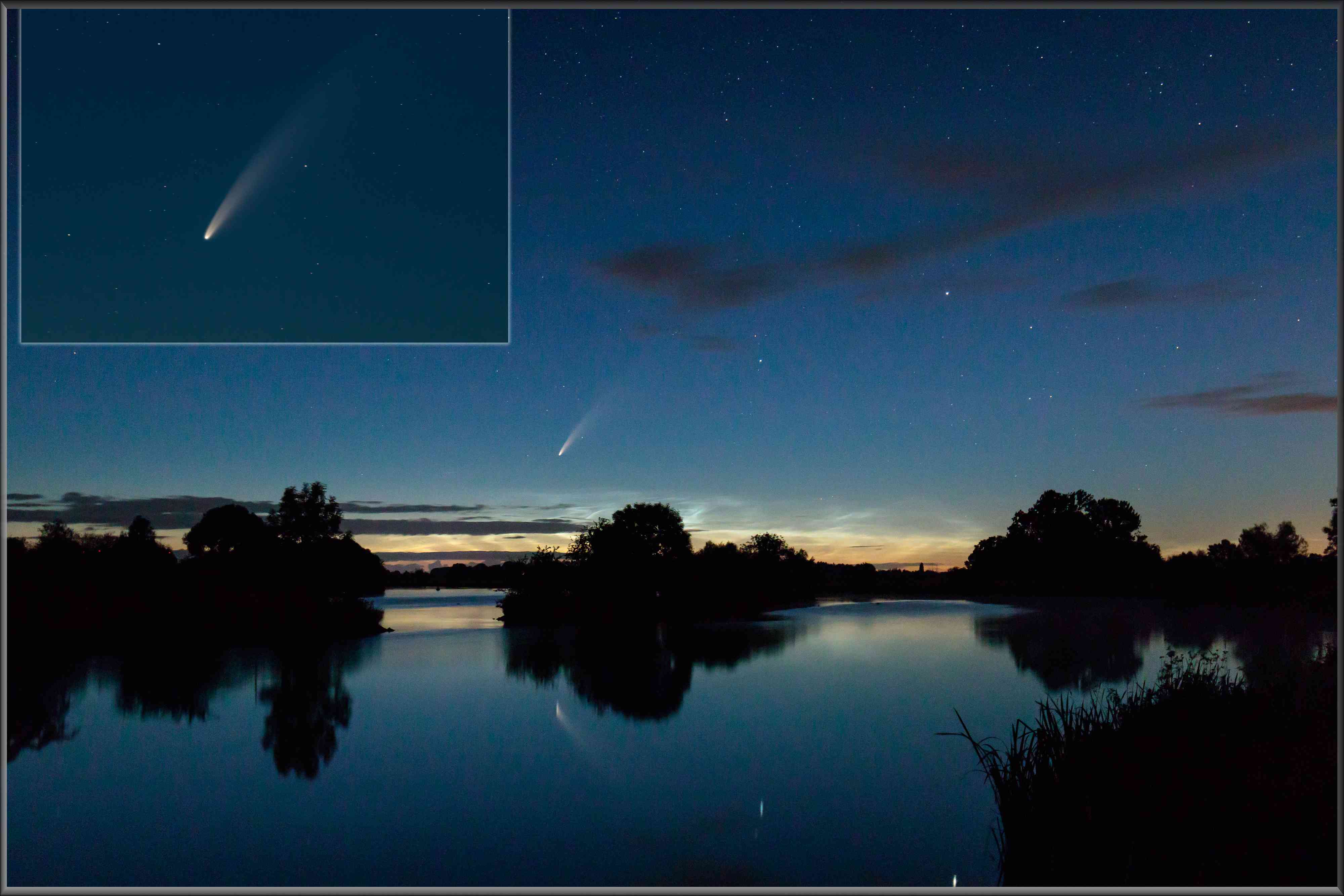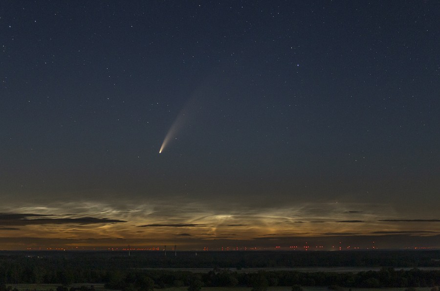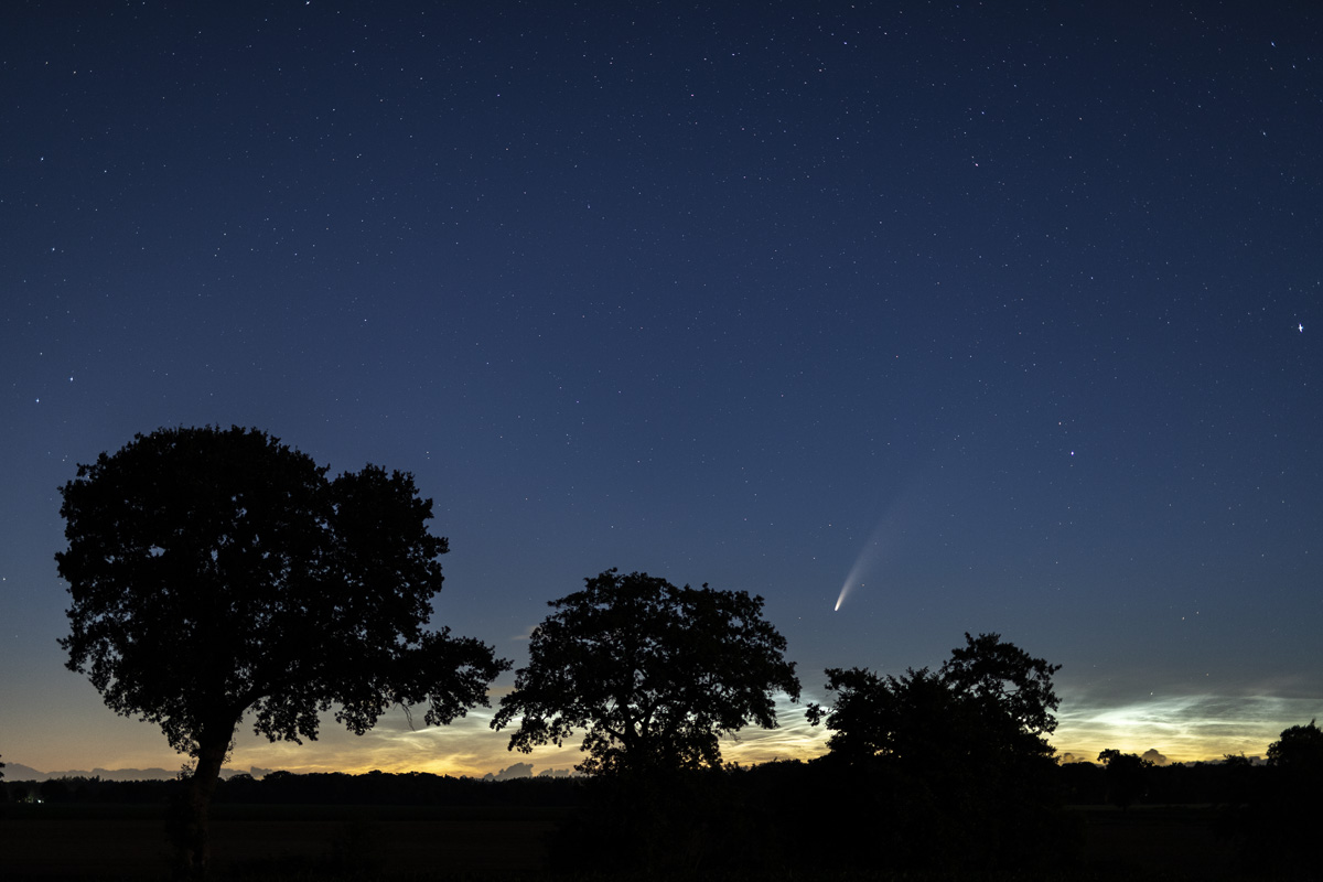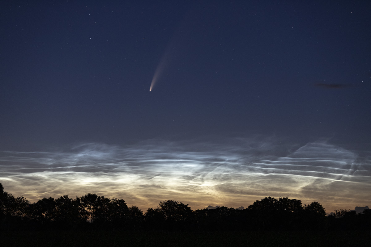 deine Bäume habe ich zwar nicht als Vordergrund aber aus meinem Küchenfenster konnte ich einen Zeitraffer mit diesen NLCs und dem Kometen darüber aufnehmen. Während der Komet langsam aufsteigt, sieht man deutlich wie die NLCs heller werden.