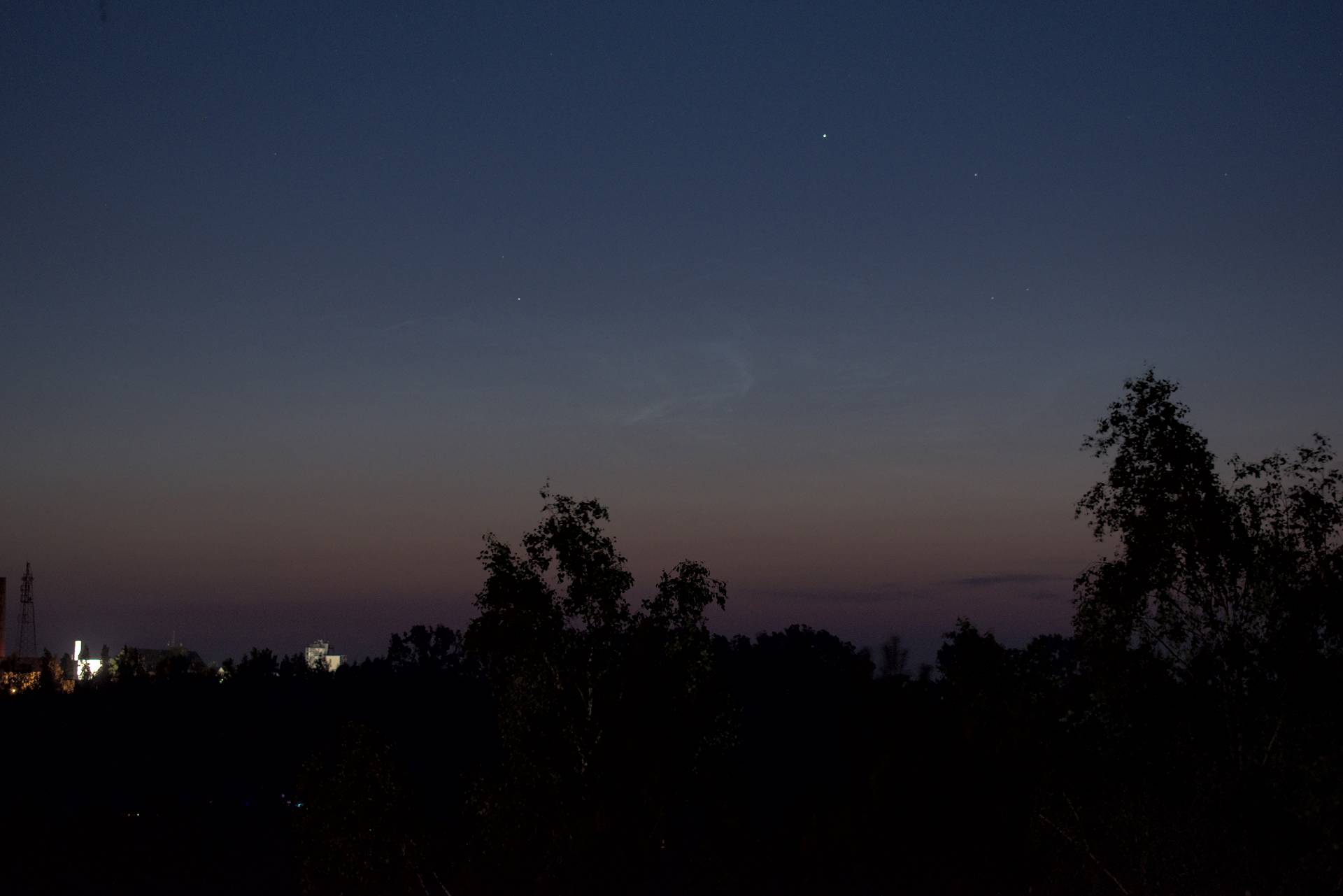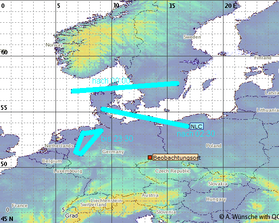 Nachdem am Abend NLCs gemeldet wurden bin ich schnell nach draußen und konnte kurz nach 23 Uhr MESZ die NLCs recht schnell nachweisen. Der hellere Teil des Display war nur für wenige Minuten sehr schwach visuell zu sehen (H1). Gegen 23:20 MESZ verblasste das Display schon sehr schnell und ich machte mich kurz danach wieder auf den Weg nach Hause.