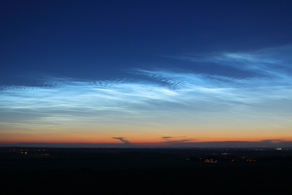 hier ein Panorama von 2:40 MESZ aus der Nähe von Heiligenhafen. Das war ein wirklich großes NLC-Ereignis heute Morgen. Später waren sogar der Mond und Jupiter von NLC umgeben. An den Bildern aus Leipzig ist auch offensichtlich, dass da eine große NLC-Front von Osten hineinzog. Später mehr.