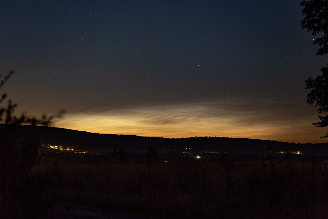 Nach einem spontanen Start auf einem Feldweg in der Nachbarschaft, Ankunft um etwa 23:20 Uhr (MESZ), konnte ich direkt die ersten NLCs erkennen (Helligkeit 1), welche mir zuvor bereits auf meinen Dachkamera-Bildern aufgefallen waren. Es folgt eine Aufnahme von einem etwas späteren Zeitpunkt, zu dem die NLCs eine Helligkeit “3” erreicht hatten und sich bereits in einem sehr warmen Licht präsentierten: