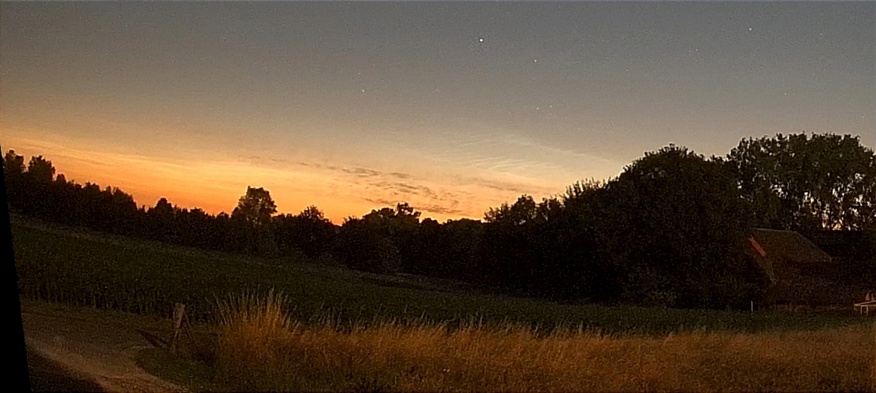 Um 22:35 MESZ konnte ich von Hamburg aus hoch im Osten NLC sehen. Das ist ungewöhnlich früh und so bemühte ich mich, möglichst schnell in die Nähe von Braak in Schleswig-Holstein zu kommen, von wo ich einen freien Blick hatte. Als ich kurz vor 23 MESZ Uhr dort ankam, waren NLC schwach fast über den ganzen Himmel zu erkennen, bis ca. 20° über dem Südhorizont. Im Norden lagen einige Wolkenfelder aus hohen oder mittelhohen Wolken, die sich in form von Virga auflösten.