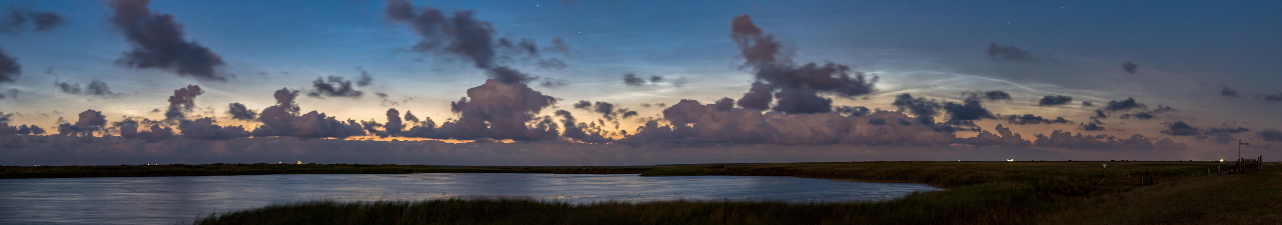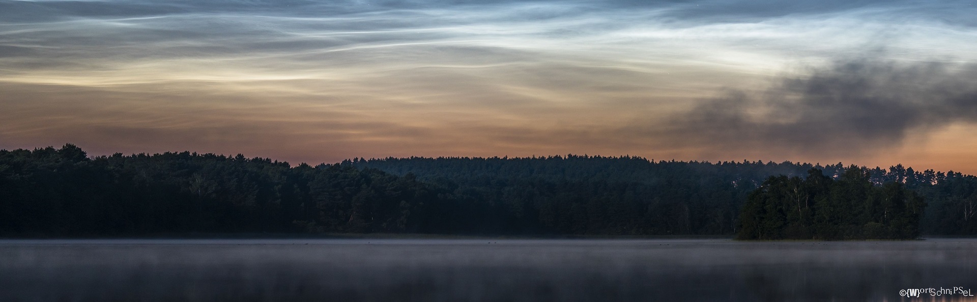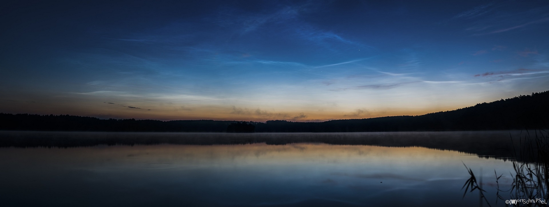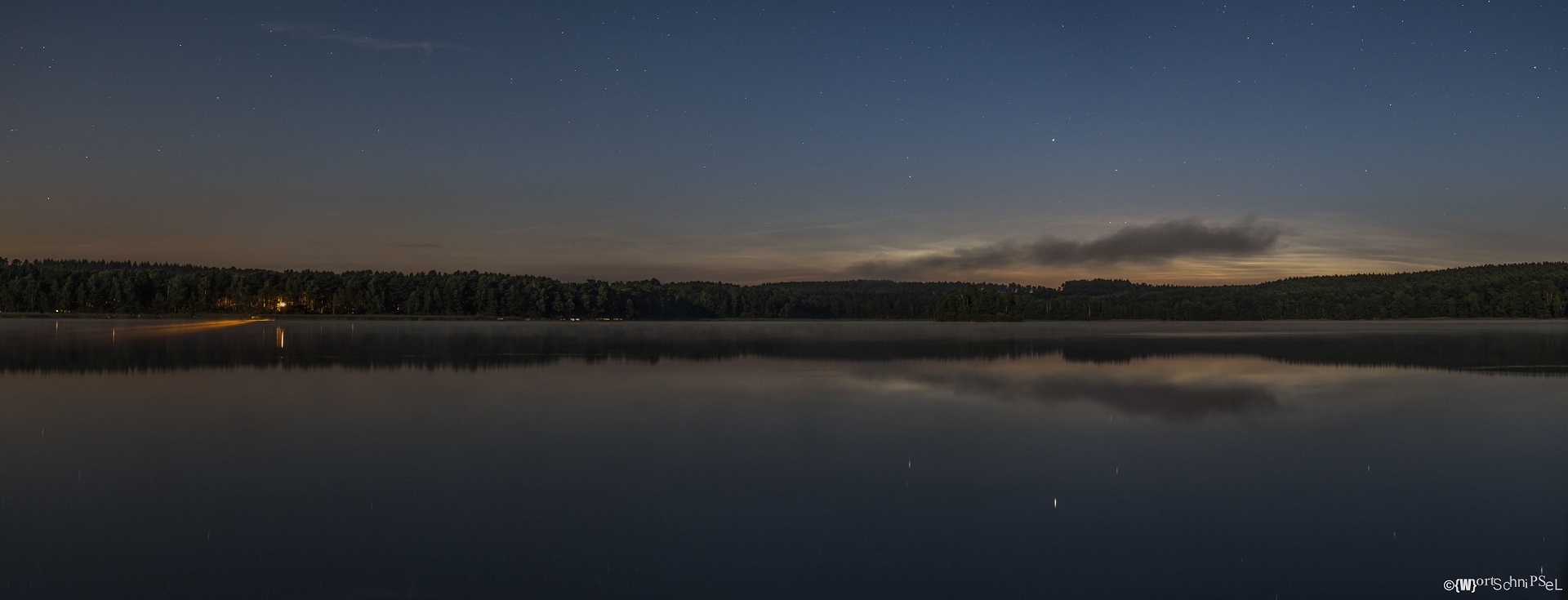 Also runter zum See, hier waren sie dann besser zu sehen, aber immer noch schwach (Helligkeit 1-2). Der Angler, mit dem ich den Steg geteilt habe, traute sich erst spät zu fragen, was ich denn da fotografieren würde. Er schien meine Erklärung "leuchtende Nachtwolken" auch nicht wirklich für überzeugend zu halten.